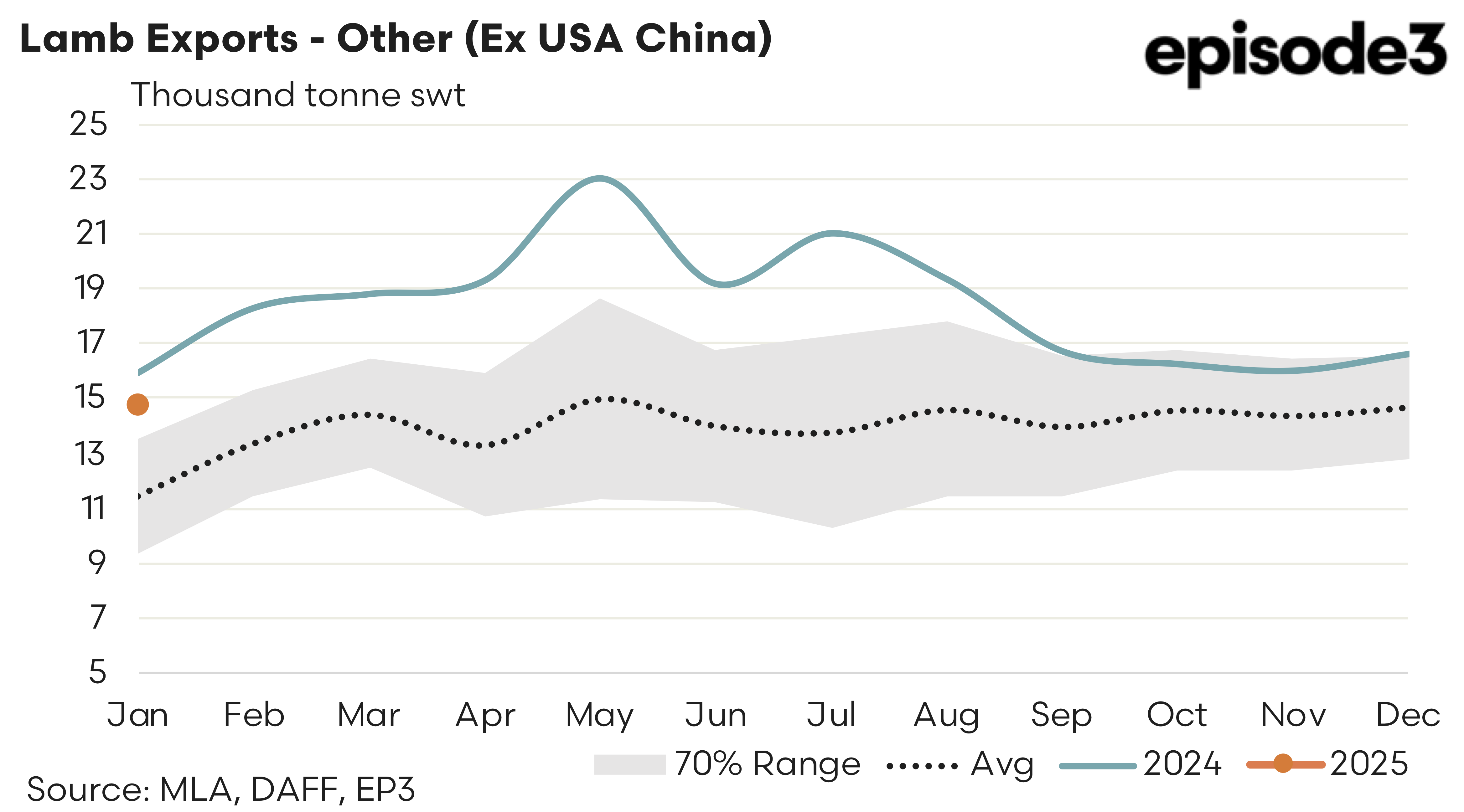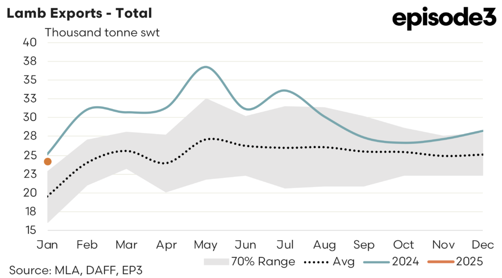 Total mutton exports for January came in at 19,776 tonnes swt, which was a 17% improvement on the January 2024 levels and sits 42% higher than the average January flows of mutton exported looking back at the last five years of the trade. Total lamb exports were a little softer than this time last year with 24,177 tonnes reported shipped over the month. This is a 4% decline on the prior year for January flows, but it must be noted January 2024 was a record high for January, so coming off the best January result on record by such a small amount is a pretty good effort. January 2025 still sits 24% above the five-year average export flows of lamb seen over January.