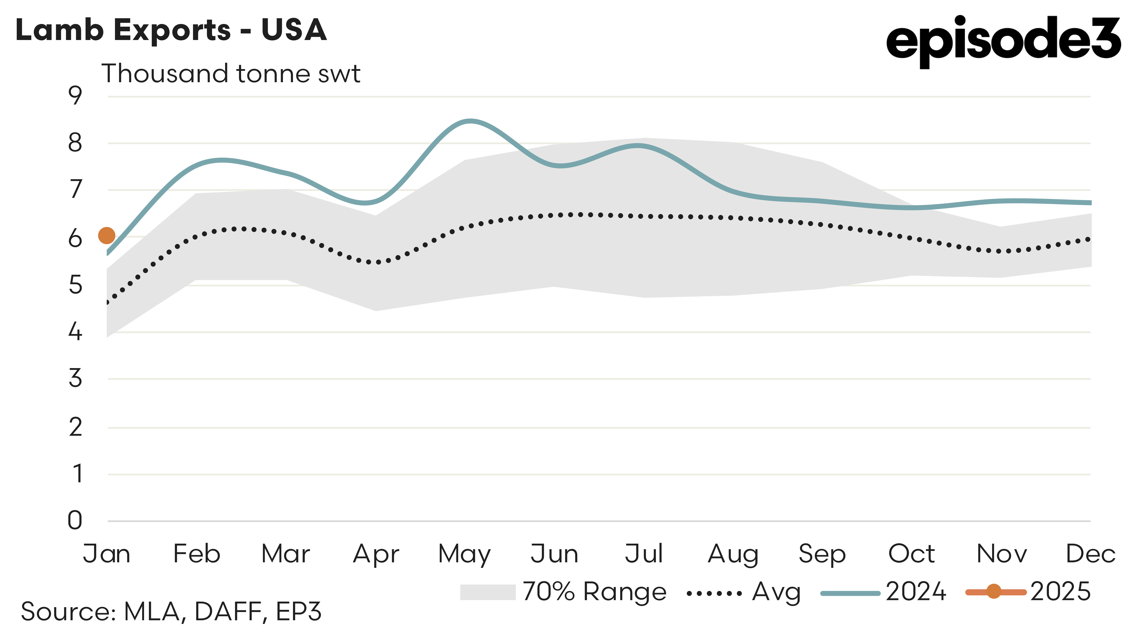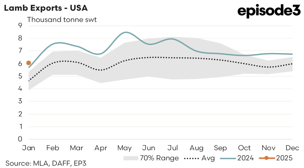 USA – The USA took 6,020 tonnes of Aussie lamb in January 2025, a new record level for January. Compared to last January Aussie lamb export to the US are 6% stronger and sit at levels 30% above the five-year January average flows.