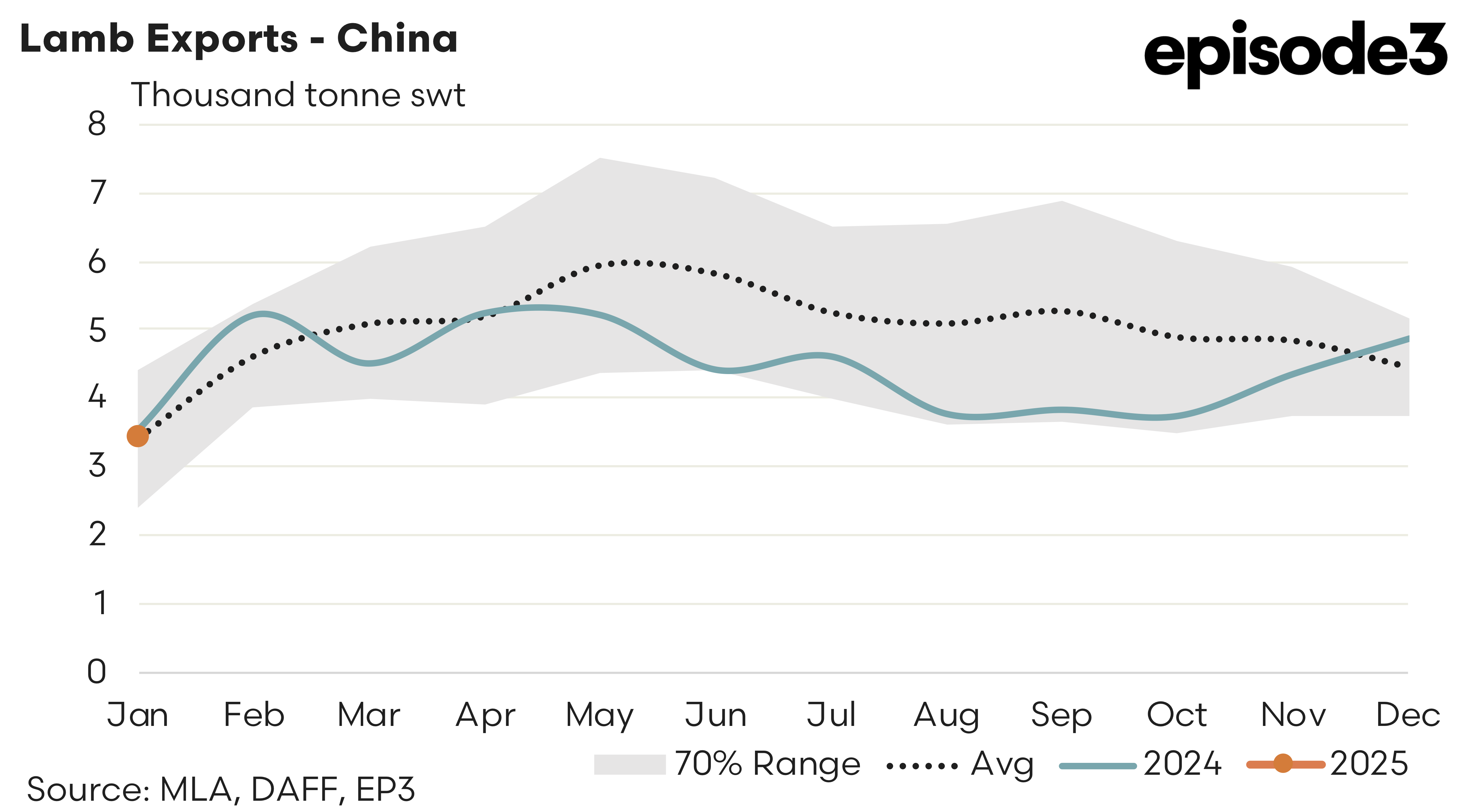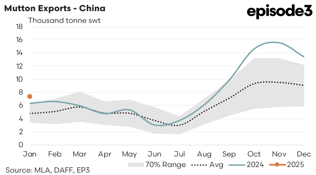 China – Flows of mutton to China in January came in at 7,326 tonnes, a 15% increase from the January 2024 levels. It is a very solid start for Chinese mutton demand from Australia as the current flows have set a new record high for January and sit 52% above the five-year January average trade volumes.