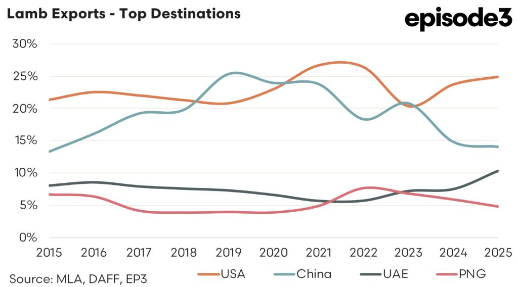 In terms of the top trade destinations for Australian lamb exports, the following was noted.