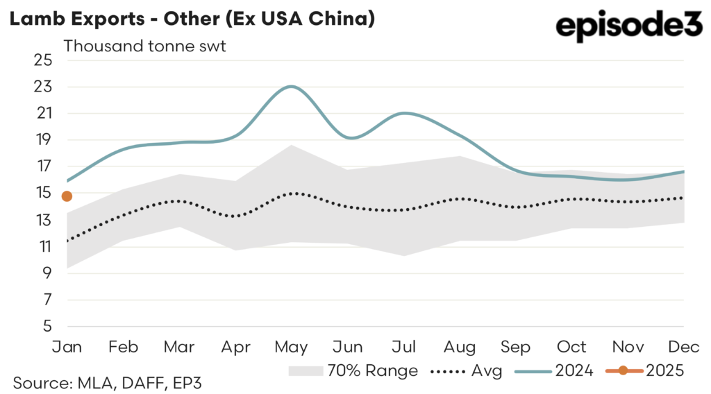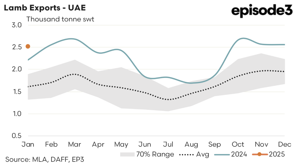 UAE – The United Arab Emirates are about to enter into a free trade agreement with Australia in 2025 so the prospects for continued growth of red meat exports appears firm. Lamb exports have started the season in very good condition with a reported 2,516 tonnes shipped over the month of January. This is a new record volume for January to the UAE and comes in nearly 14% above January 2024 and 56% above the January average levels, based on the last five years of the trade. It will be interesting to see how the FTA impacts trade volumes as the year progresses.