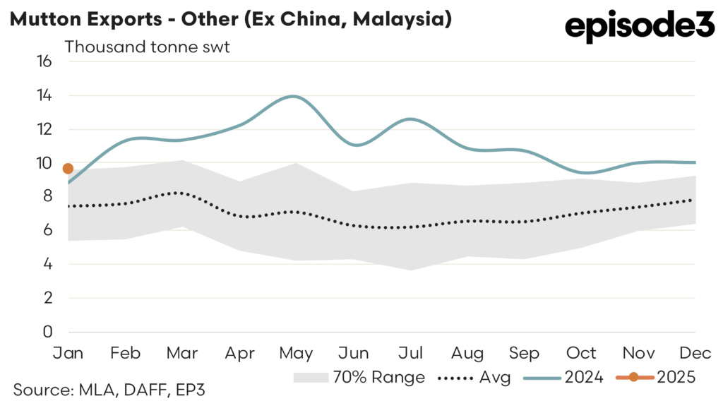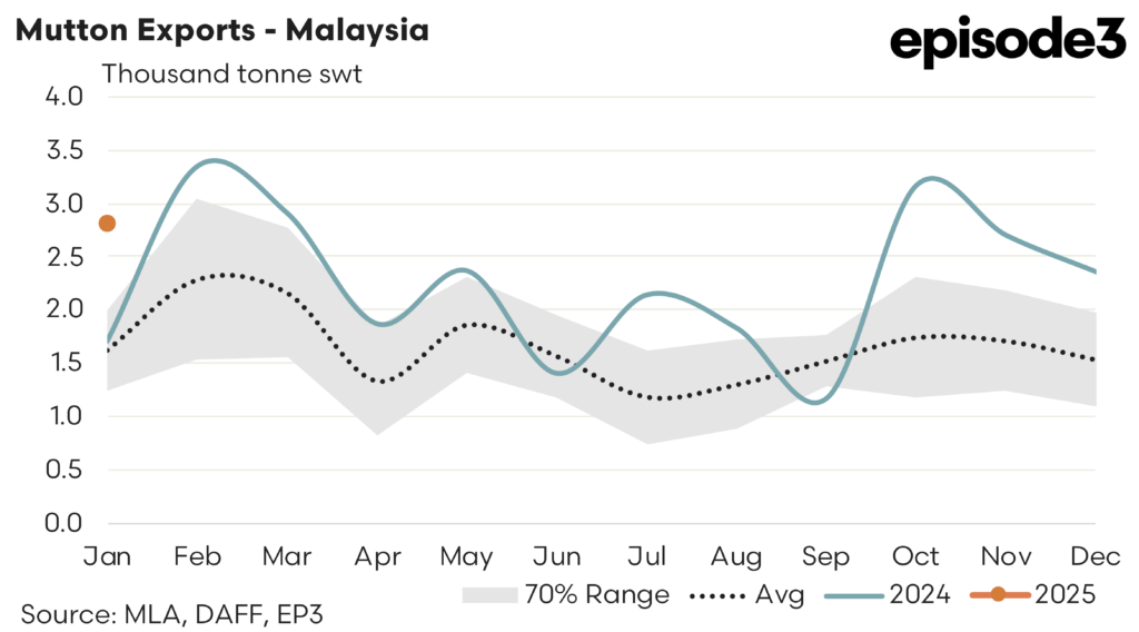 Malaysia – Mutton to Malaysia also hit a new January record level at 2,792 tonnes. This represents 63% gain on the January 2024 volumes and sits 71% above the January average, based on the last five-years of mutton exports.
