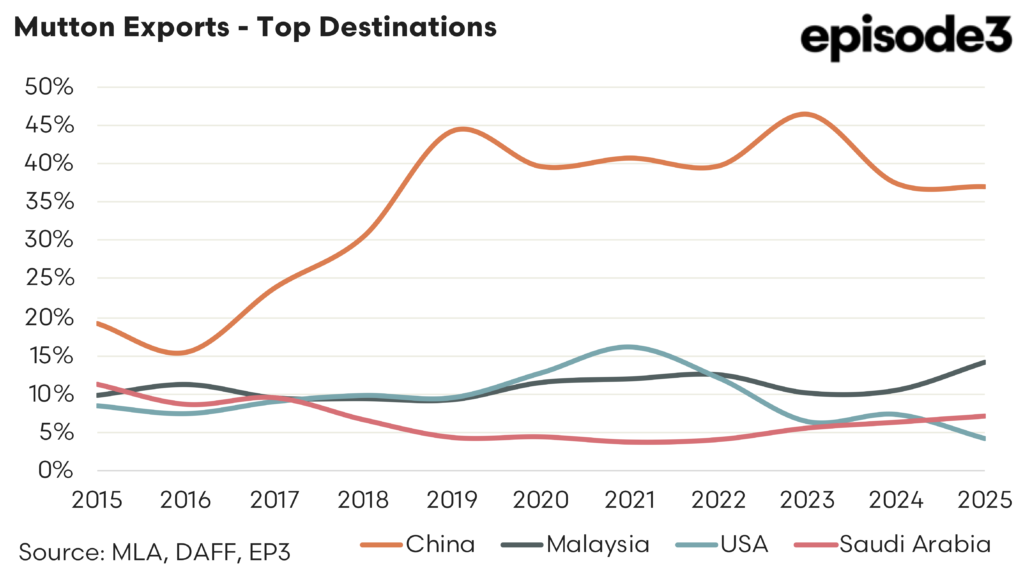 A look at the market share of top trade destinations for mutton shows that China remains in the dominant spot for early 2025. Also noticeable in the last few years is the rise of mutton demand from Malaysia, which has out performed the USA in recent years. Indeed, the US has been demoted to fourth top trade destination now behind Malaysia in second place and Saudi Arabia in third spot.