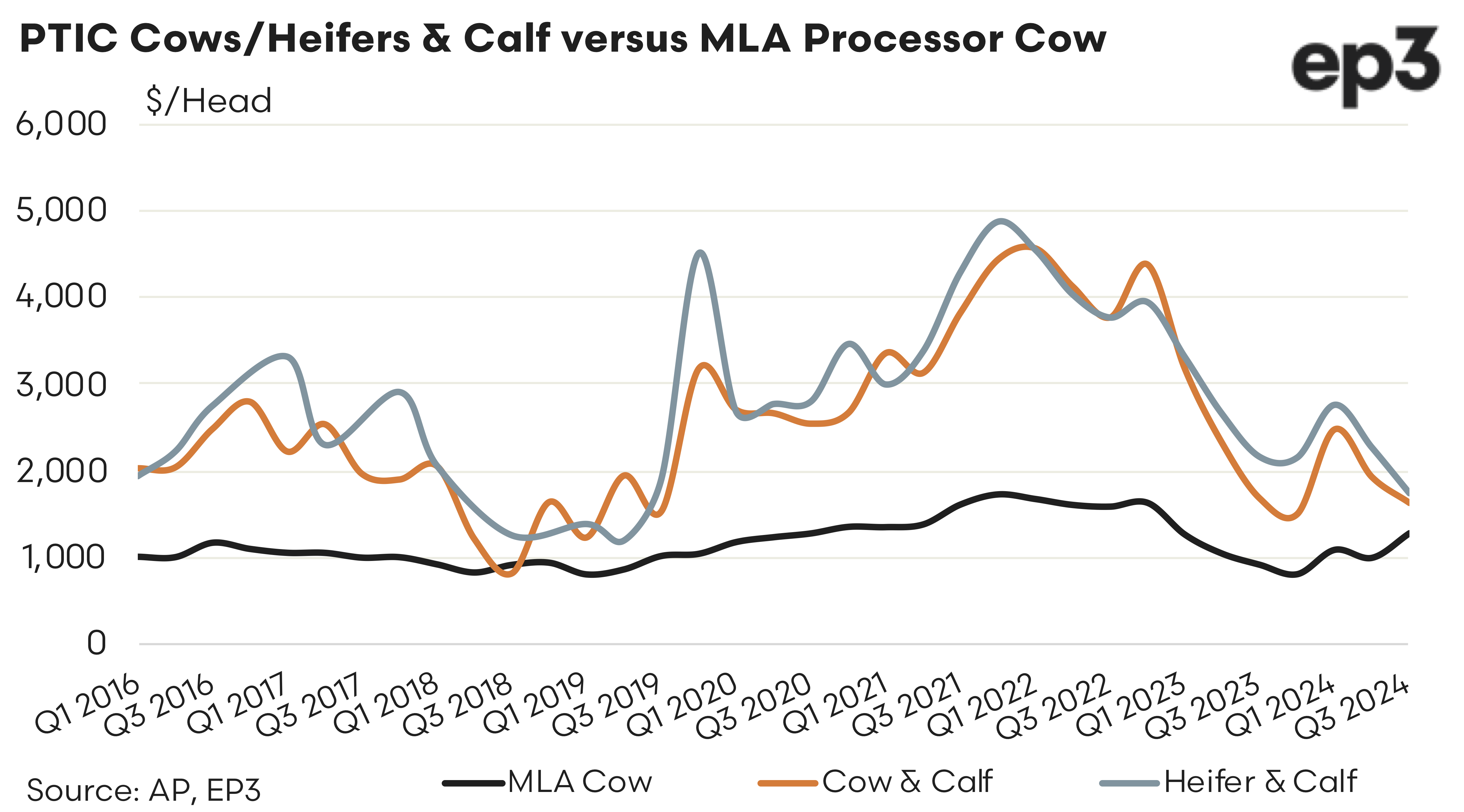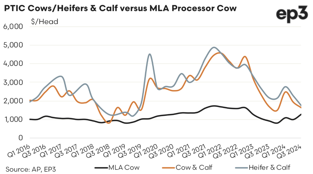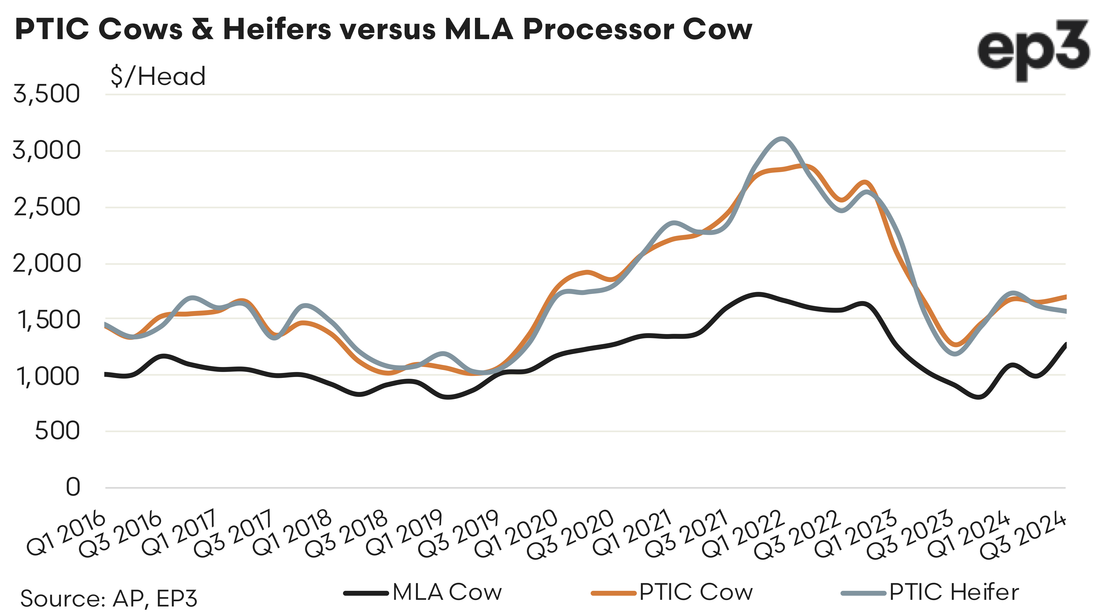 A comparison of closing price levels for 2023 versus the Q3 2024 prices highlights that the MLA processor cow has lifted around 58% over the last year, increasing from a quarterly average price of $809/head in the final quarter of 2023 to $1,277/head as at Q3 2023. Meanwhile over the same time frame the AuctionsPlus PTIC cow indicator has gained just 16%, from $1,474 to 1,703/head, and the PTIC heifer has lifted just 9%, from $1,449 to $1,575/head.