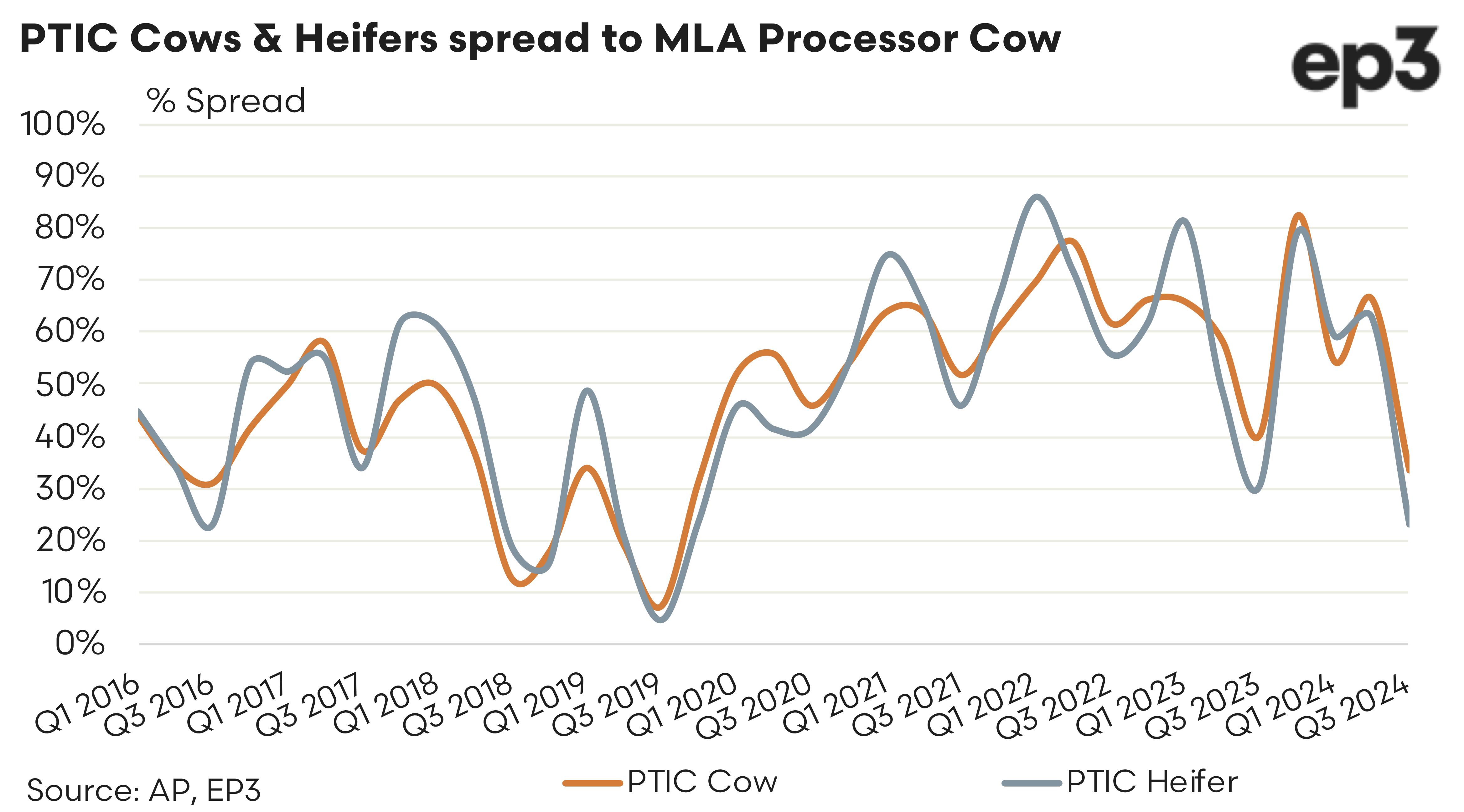 Further contributing to the narrower PTIC premium spreads during Q3 2024, besides the current producer sentiment favouring herd liquidation, are the elevated PTIC numbers sold on the AuctionsPlus platform versus the 2023 season.
