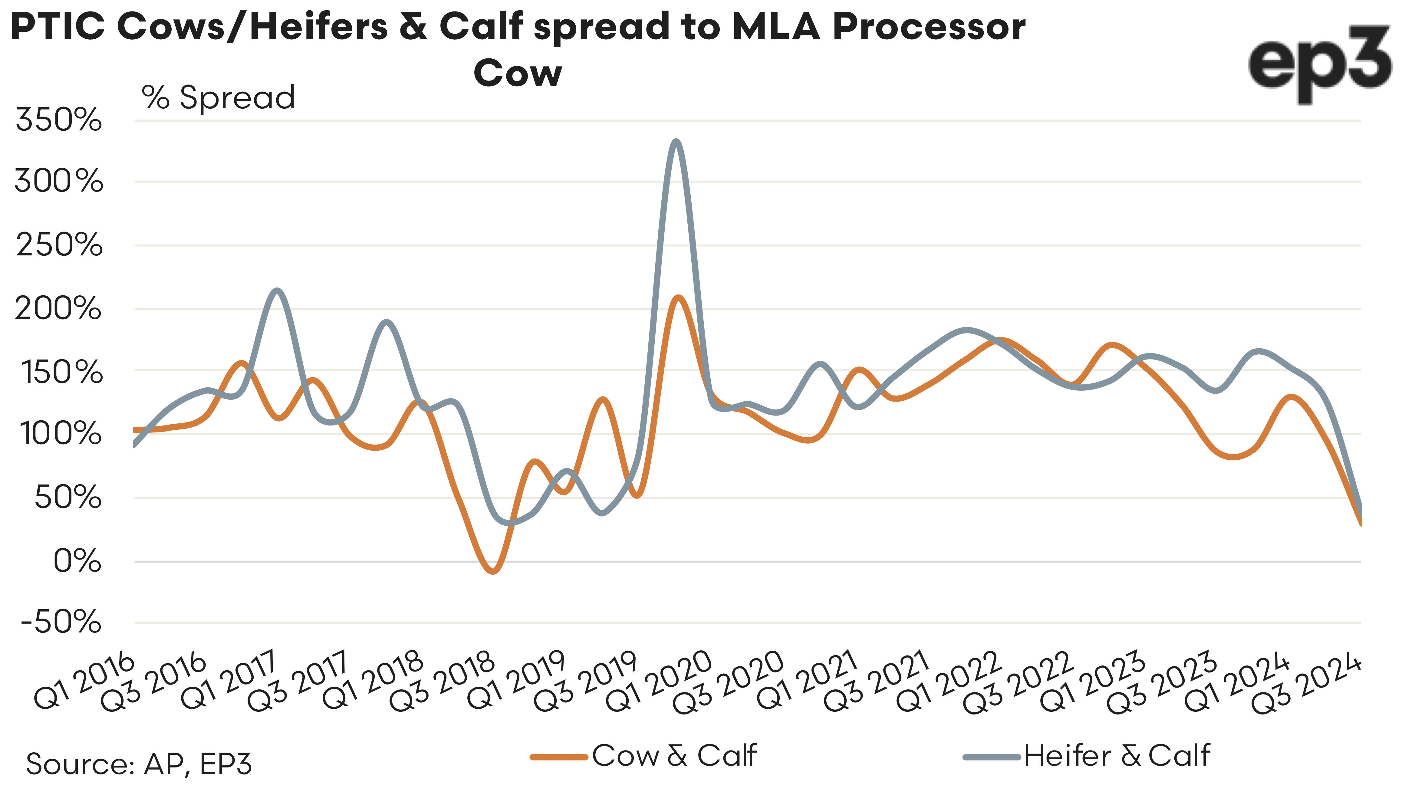 The change in producer sentiment towards breeding stock is highlighted when analysis of percentage price spreads is outlined for PTIC types versus the MLA processor cow indicator. As the charts below identify price spreads for PTIC cows and heifers have narrowed from 80% premiums in Q4 2023 to 25-35% premiums as at Q3 2024. Similarly PTIC cow with calf spreads have dropped from 90% to 30% and PTIC heifer with calf spreads have fallen from 150% to 35% over the same time frame. Indeed, price premiums for all PTIC categories are currently at, or rapidly nearing, the rather narrow spread levels seen during the 2019 drought and cattle liquidation phase.