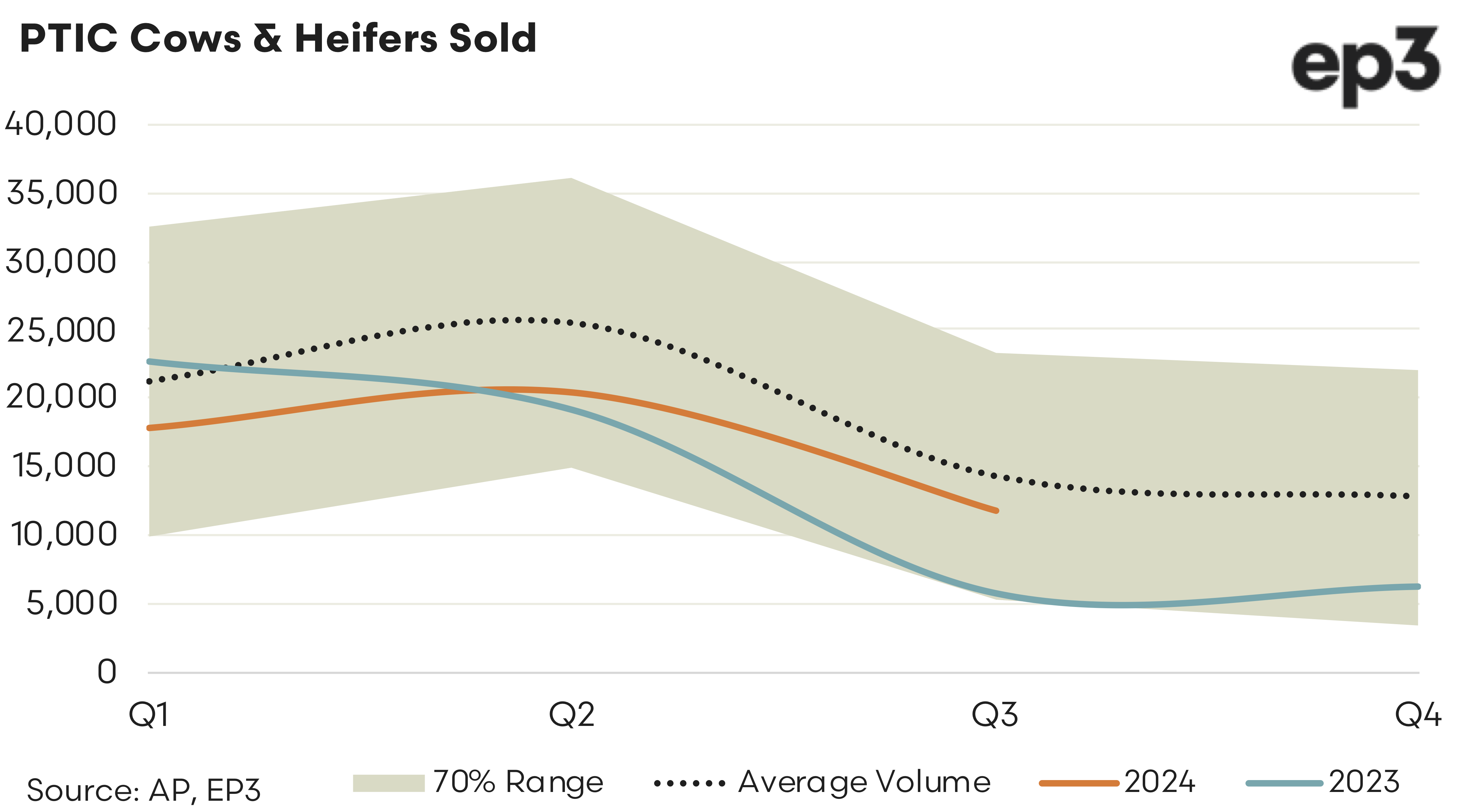 As the seasonal sales volume chart demonstrates below while current PTIC volumes remain below the average quarterly volumes seen since 2016 the sales levels seen during the third quarter of this year are about double the volumes seen during Q3 of 2023, when the herd rebuild was in full swing and breeding stock was more difficult to find.