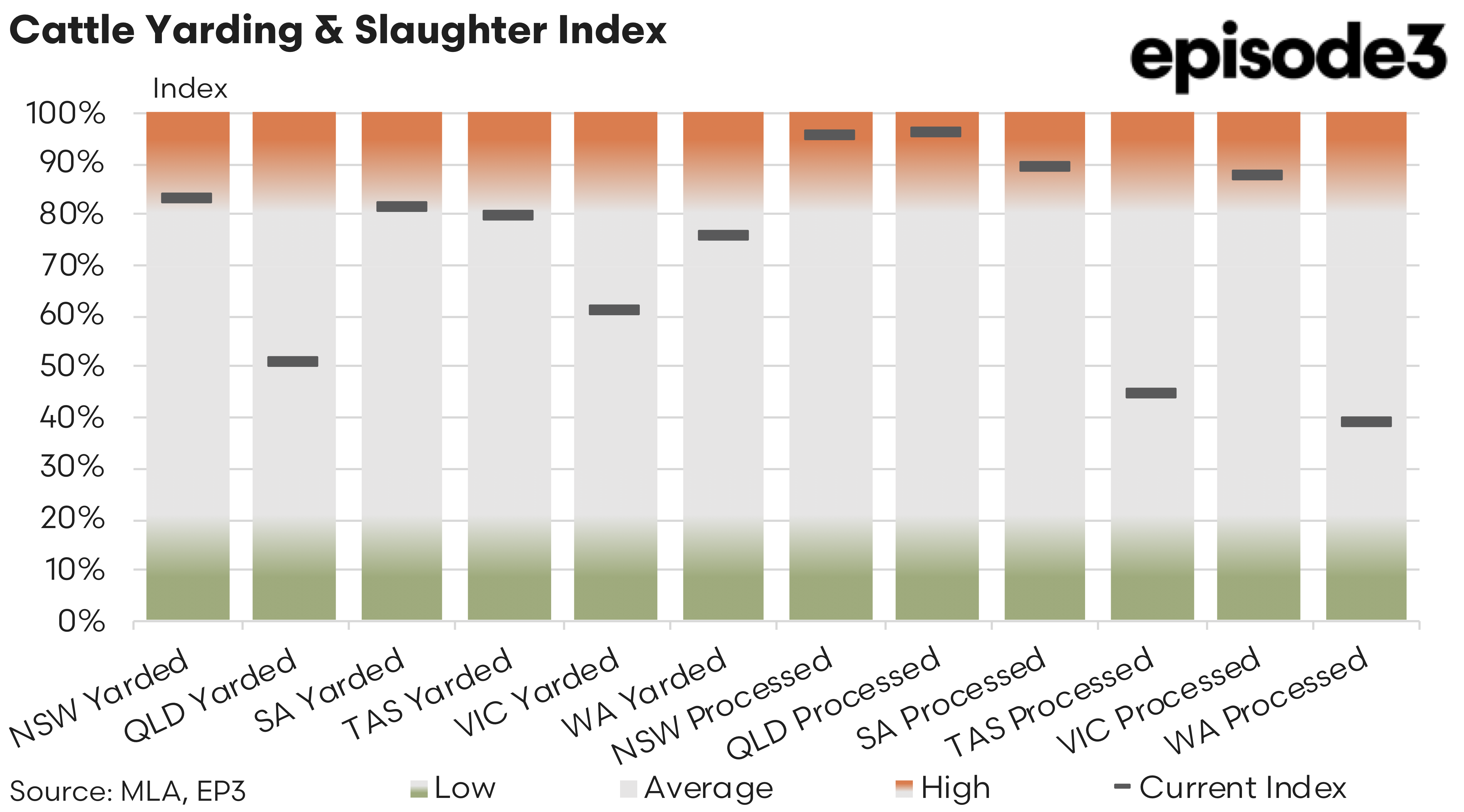 The mainland eastern states are all reporting cattle slaughter index scores in the high 80s to mid 90s, with NSW and Queensland based meat works registering a score of 96% apiece, with demonstrates that current processing volumes in the north are running higher than 96% of all weekly records over the last five years.
