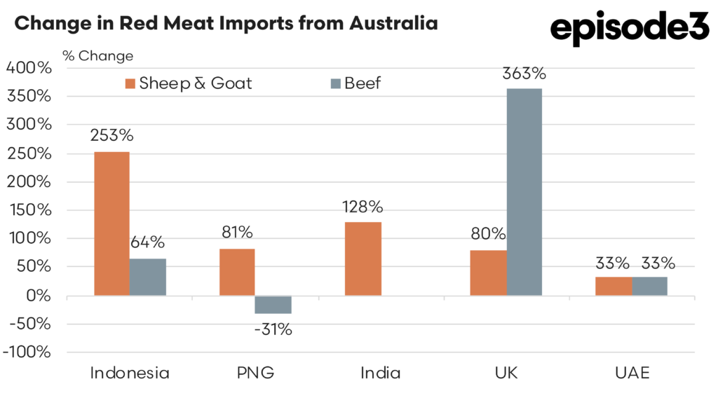 Free Trade Agreements (FTAs) signed since 2020 have unlocked greater access to developing markets and Australia has already begun to see significant growth in red meat exports to nations like Indonesia, PNG, India, and the UK, with further opportunities emerging in the UAE and ongoing negotiations with the EU.