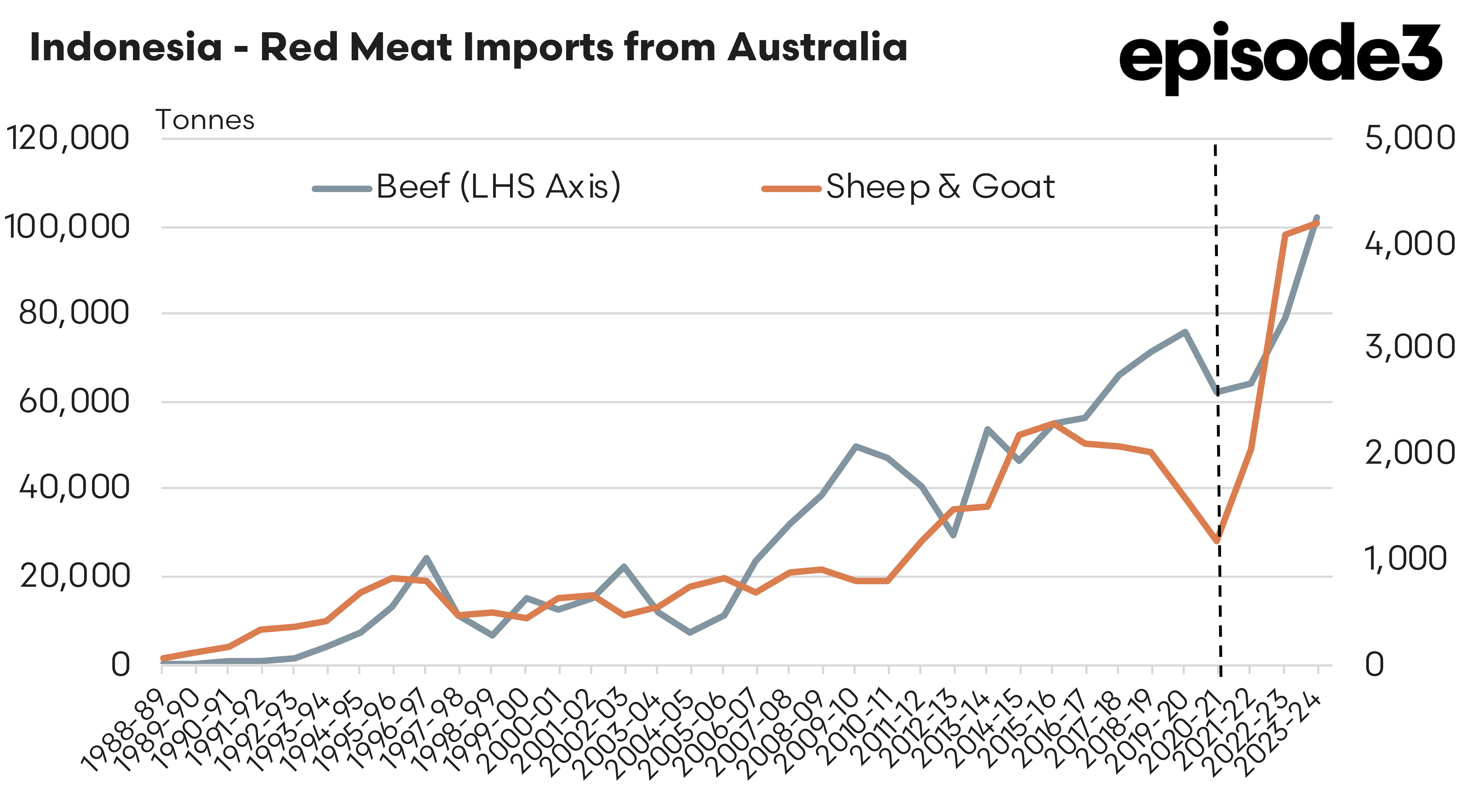 The Indonesia-Australia Comprehensive Economic Partnership Agreement (IA-CEPA), formalised in July 2020, has been a standout trade development for Australian red meat exports. Since its inception, Australia’s beef exports to Indonesia have grown significantly, rising by 64% from 62,000 tonnes to 102,000 tonnes. This growth has been underpinned by Indonesia’s increasing demand for quality protein as its population grows and consumer incomes rise. The chart below shows a dotted line where the FTA came into force and the growth in Australian red meat exports to Indonesia since then.