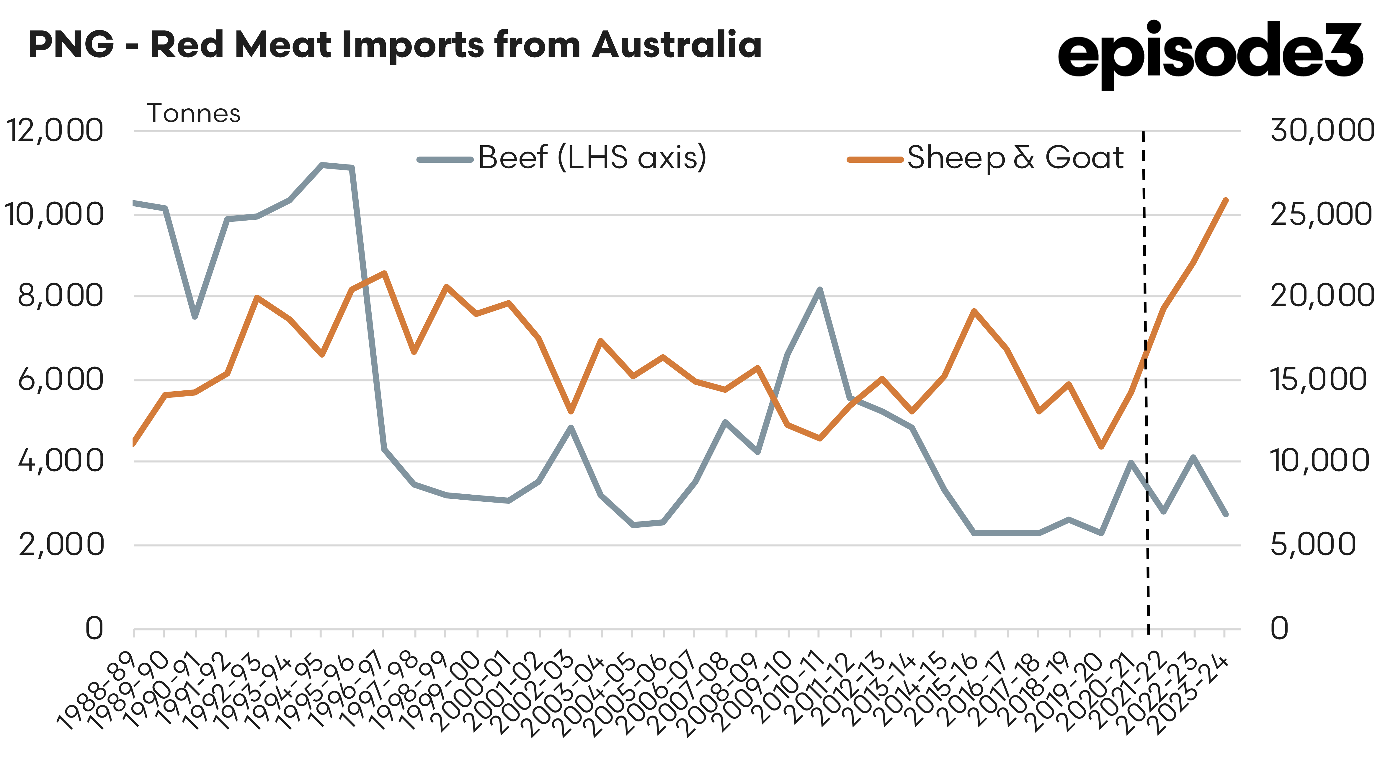 Australia’s FTA with Papua New Guinea, which came into force in December 2020, has delivered similarly strong results in the sheep/goat meat sector. Exports to PNG have climbed by 81%, growing from 14,000 tonnes in FY2020/21 to 26,000 tonnes by FY2023/24.