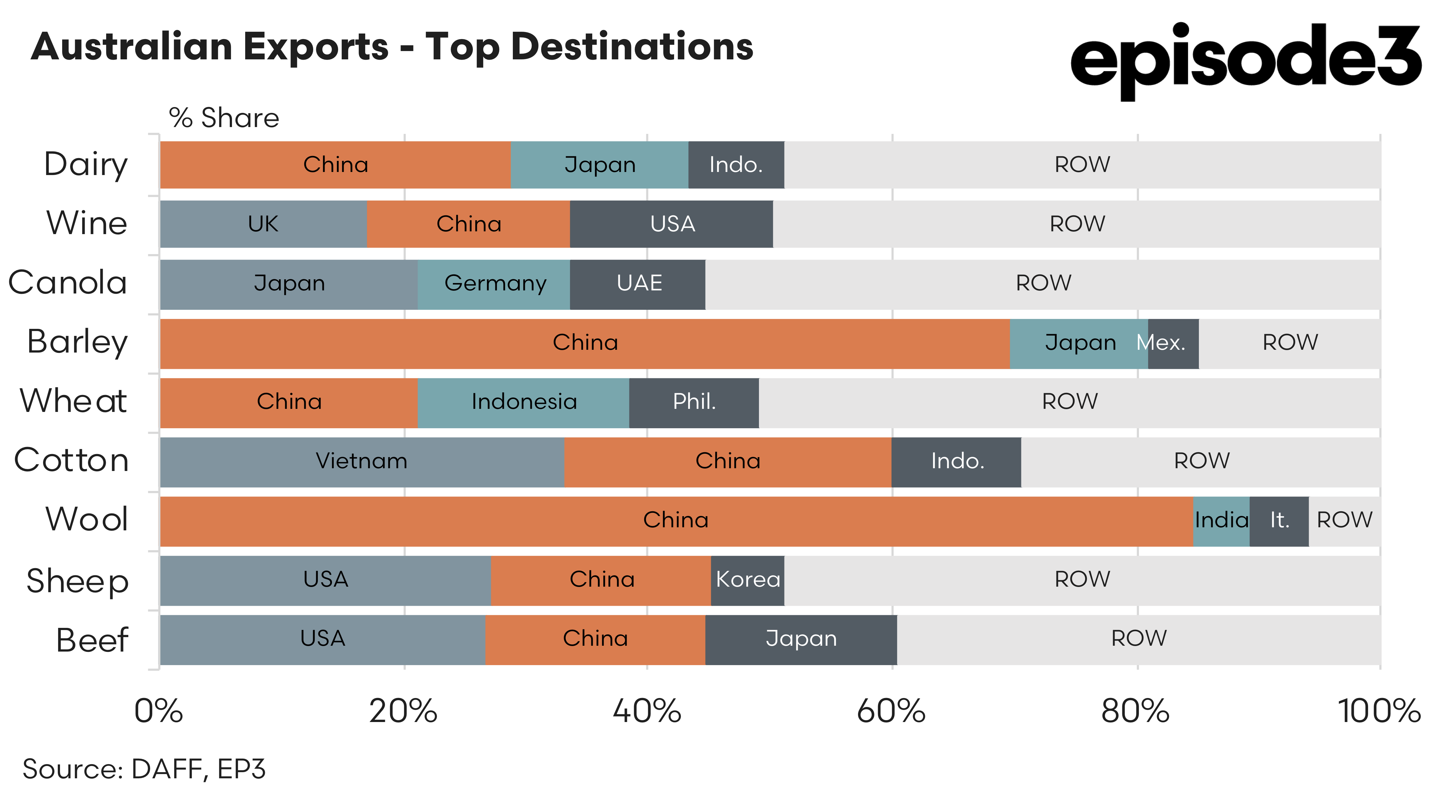 For Australia, the implications of a weakened Chinese economy are particularly pronounced given its heavy reliance on China for agricultural exports. As illustrated by the trade share data, China remains Australia’s top export destination for wool, cotton, dairy, barley, and beef. In wool, for instance, China dominates over 80% of Australian exports, reflecting its pivotal role in the textile and garment manufacturing sectors. Likewise, China is Australia’s largest market for cotton, a product that aligns with its vast textile industry. The same dependency is visible in barley, where China accounts for a significant share, driven by its brewing and livestock feed demand. Should Chinese economic troubles persist, demand for these products could falter, impacting Australian producers’ revenue and profitability.