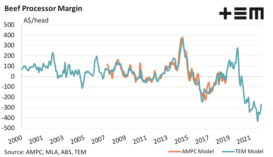 February 2022 has seen the monthly average margin narrow from a loss of $345 per head in January to a loss of $272 per head of cattle processed. This is the best monthly result seen for the model since June 2021 and brings the average annual margin for 2022 to a loss of $308 per head.