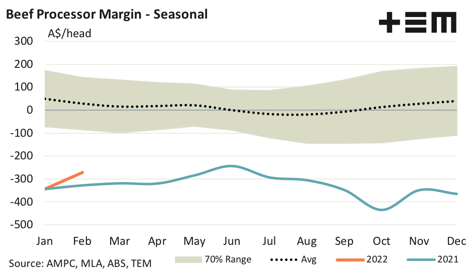 - February 2022 has seen the monthly average margin narrow from a loss of $345 per head in January to a loss of $272 per head of cattle processed.