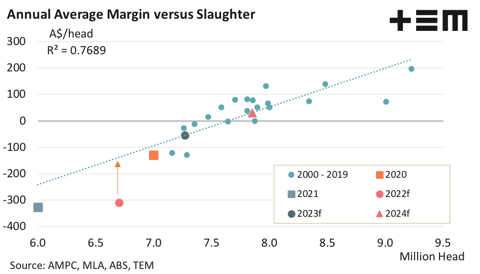 Analysis of the annual average processor margin, according to the model, versus the annual Australian cattle slaughter volumes highlights a reasonably strong relationship between the two series.
