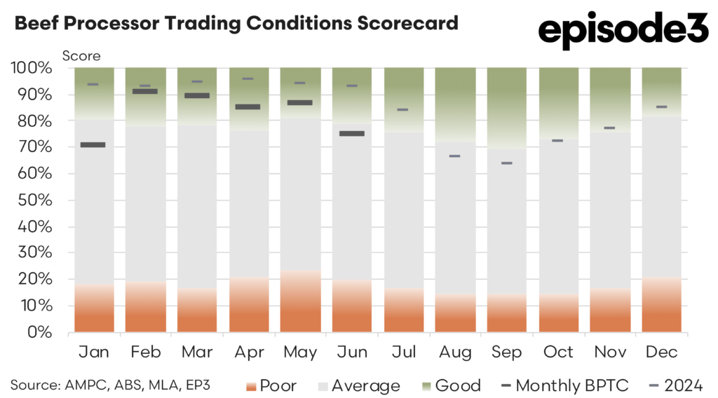 While the June BPTC score of 75% still indicates that most processors are operating at a margin, the decline from May’s revised high points to growing fragility in trading conditions. The annual average to date remains respectable, but the mix of rising cattle prices, falling pharmaceutical revenues and softness in key export markets presents a warning sign for the months ahead.