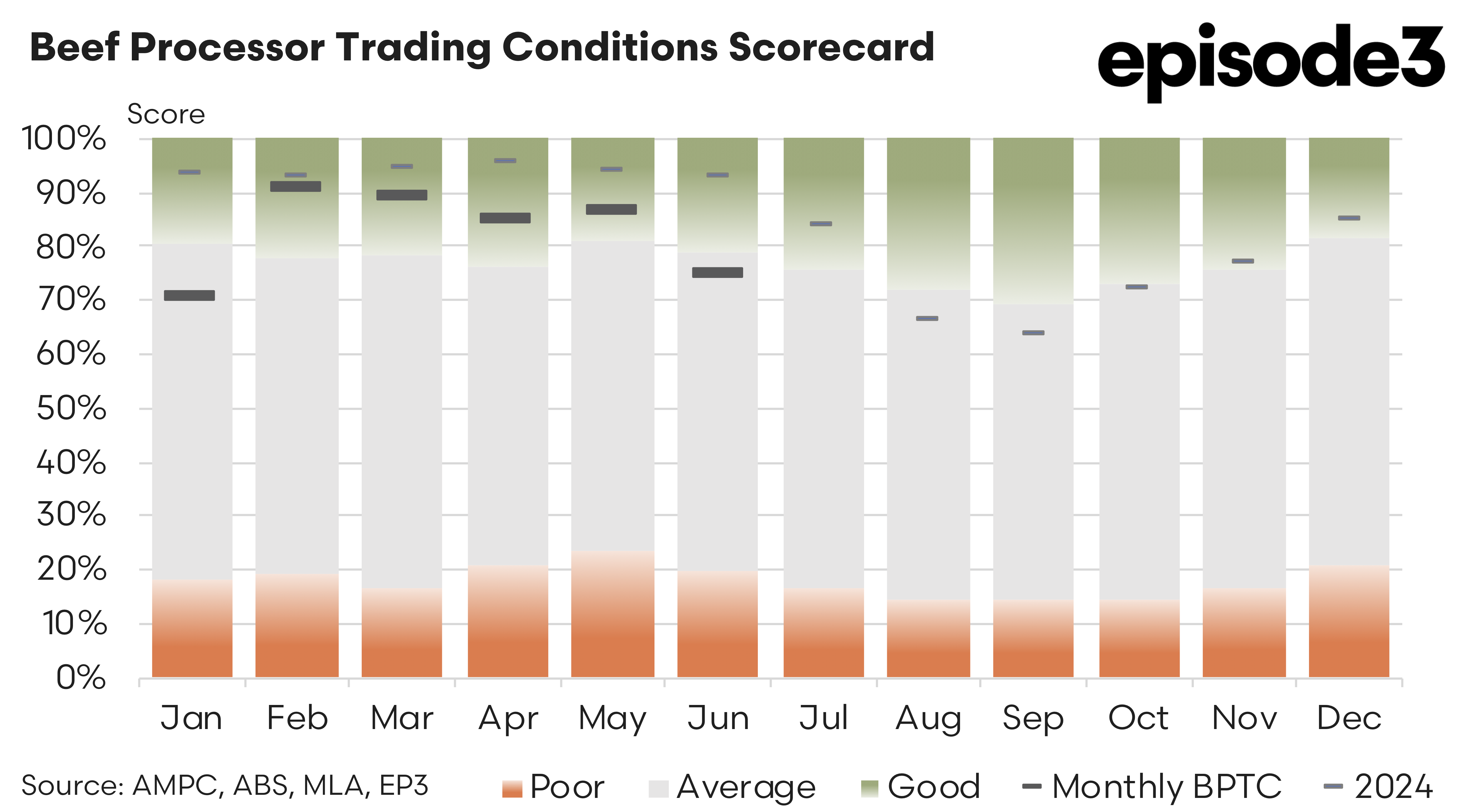 Australia’s beef processors enjoyed a notable improvement in trading conditions through the first half of 2025, with the Beef Processor Trading Conditions (BPTC) index undergoing substantial upward revisions following updates to data on co-products, rendered materials and pharmaceutical revenue. While conditions improved more than initially reported for earlier months, the most recent figures for June suggest some pressure is starting to re-emerge as input costs rise and key revenue streams soften.