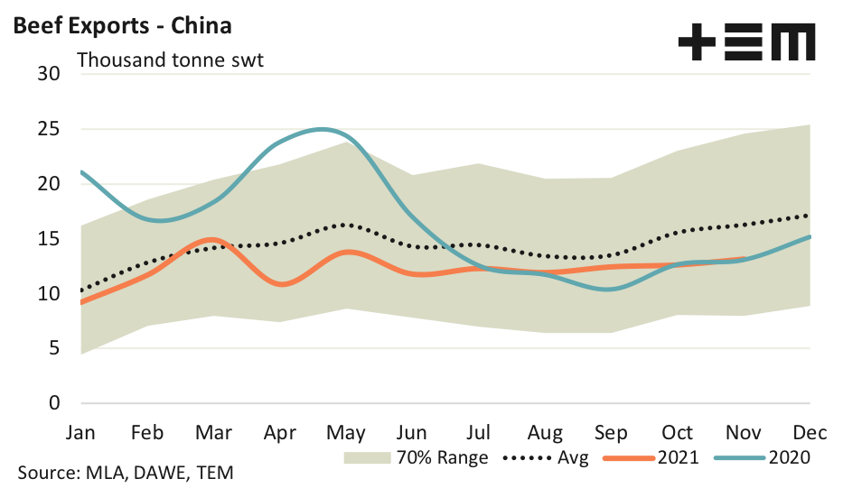 - China saw a 4% increase in Australian beef export flows over the month, but are still operating 19% under the volumes usually seen in November, based on the five-year average flows.