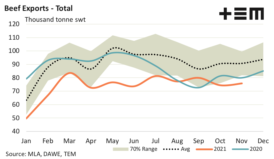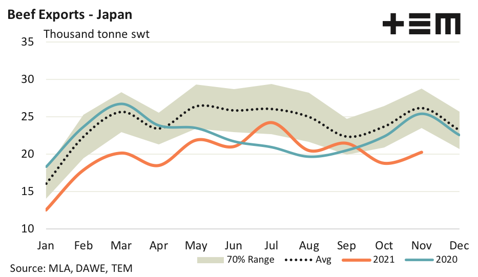 - The subdued performances in Japan, China and the USA keeping total Australian beef exports relatively static, with just a 2% lift in total flows for November. Total beef exports volumes from Australia in November are nearly 17% under the seasonal trend.
