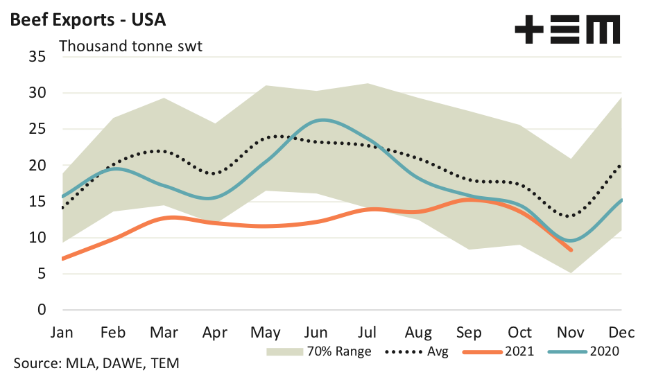 The USA was the only top four beef export destination to record a fall in trade flows over November with volumes easing 39% over the month to just 8,254 tonnes. This is the lowest monthly volume to the US since January 2021 and the weakest November figure on record (back to the early 1990s). Current Australian beef exports to the USA are 36% below the five-year average for November.