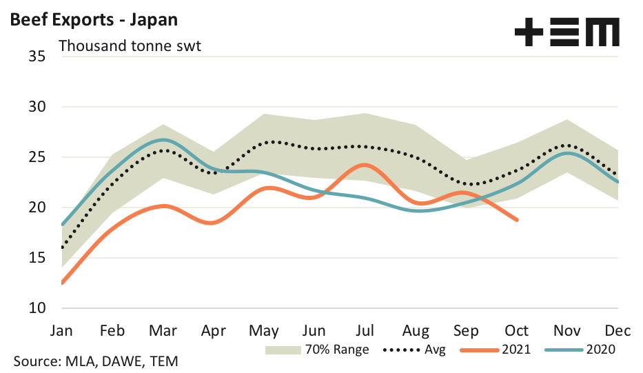 - Australian beef export flows to Japan eased 12% during October to see just 18,769 tonnes swt consigned.