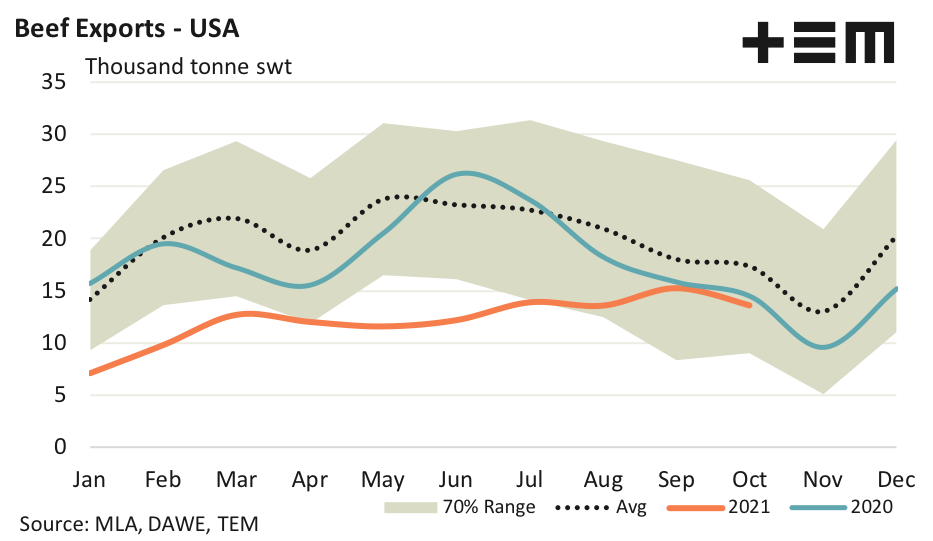 Across the 2021 season, thus far, Aussie beef exports to South Korea have averaged 13,200 tonnes per month which is just 100 tonnes short of the average monthly flows seen over the last five years, signalling Korean demand for Aussie beef have remained pretty consistent despite the high prices, low supply and supply chain disruptions. A remarkable achievement considering the other top destinations for Aussie beef; China, Japan and the USA, are 13%, 17% and 39% under trend, respectively.