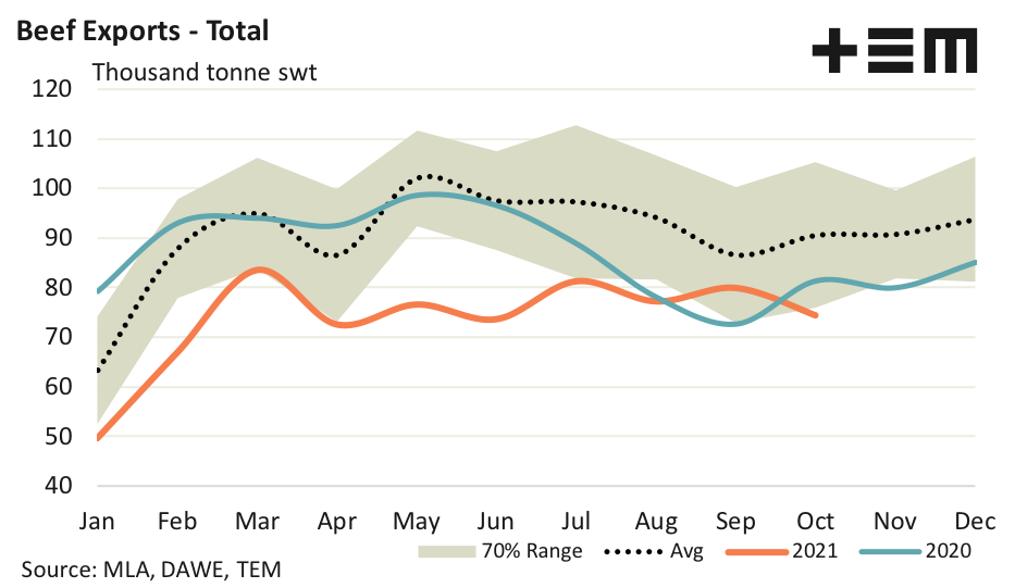 With three out of the top four beef export destinations recording flat to softening result its somewhat unsurprising to see that total Australian beef exports eased during October by 7%. There were 74,333 tonnes of beef exported from Australia over the month, 18% below the 90,500 tonnes we have seen sent in October, according to the five-year average pattern.