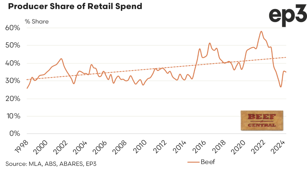 Sideways movements for both saleyard and retail prices in the cattle sector saw the producer share of the retail price for beef almost unchanged, easing marginally from 35.2% in Q1, 2024 to 35.0% for Q2, 2024. Meanwhile the stronger increase at the consumer end of the market for lamb, compared to the marginal lift at the saleyard, saw the producer share of the retail price for lamb slip from 59.7% in the March quarter to 55.8% during the June quarter, 2024.