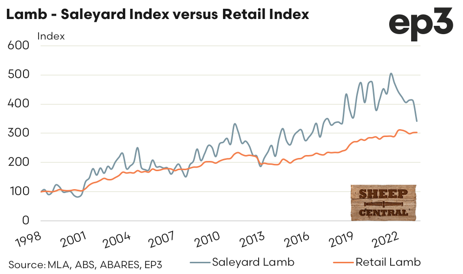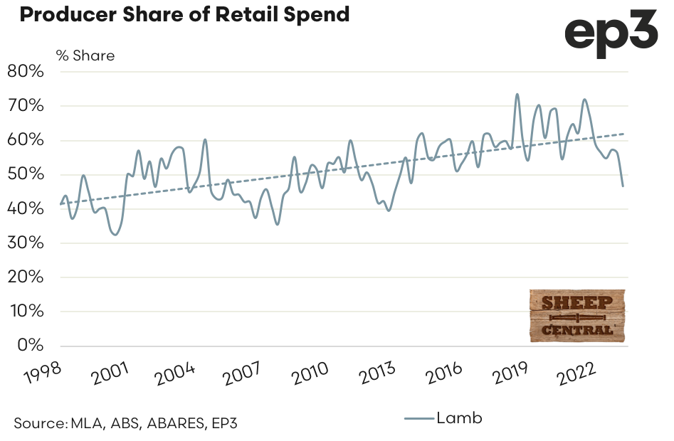In conjunction with Sheep Central, and with the approval of Meat & Livestock Australia (MLA), the team at Episode 3 will begin reporting each quarter on lamb producer’s share of the retail spend on sheep meat products. Quarterly national sale yard lamb prices in carcass weight terms have been converted into an estimated retail weight equivalent and compared to average retail sheep meat prices, as reported by the Australian Bureau of Statistics (ABS).