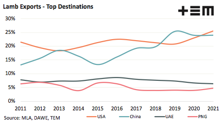 The USA regained the lead from China in terms of market share of volume during 2021 to see Aussie lambs flows to the USA at 25.5% of total flows, compared to 23.9% for China. The United Arab Emirates (UAE) comes in at third place for market share volume at 6.4% and Papua New Guinea (PNG) has moved into fourth spot this year, after displacing Qatar, with 4.7% of the market share of total lamb export trade volumes.