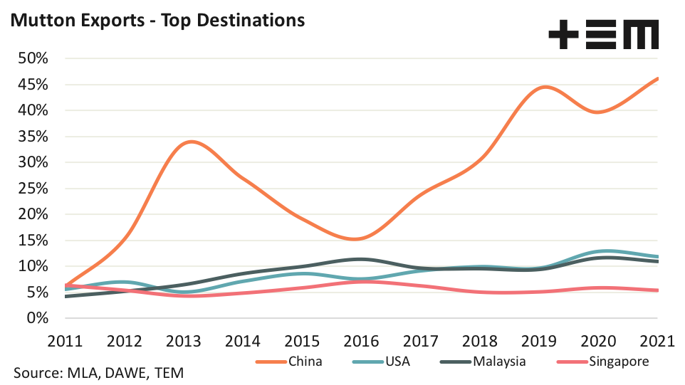 In terms of mutton export volumes, Chinese demand dominates the export market share, capturing 46.1% of the flows in 2021. The USA and Malaysia are in a close tussle for second and third placing on 11.8% and 10.9%, respectively. Meanwhile, Singapore holds the fourth spot with 5.4% of the market share of mutton export volumes.