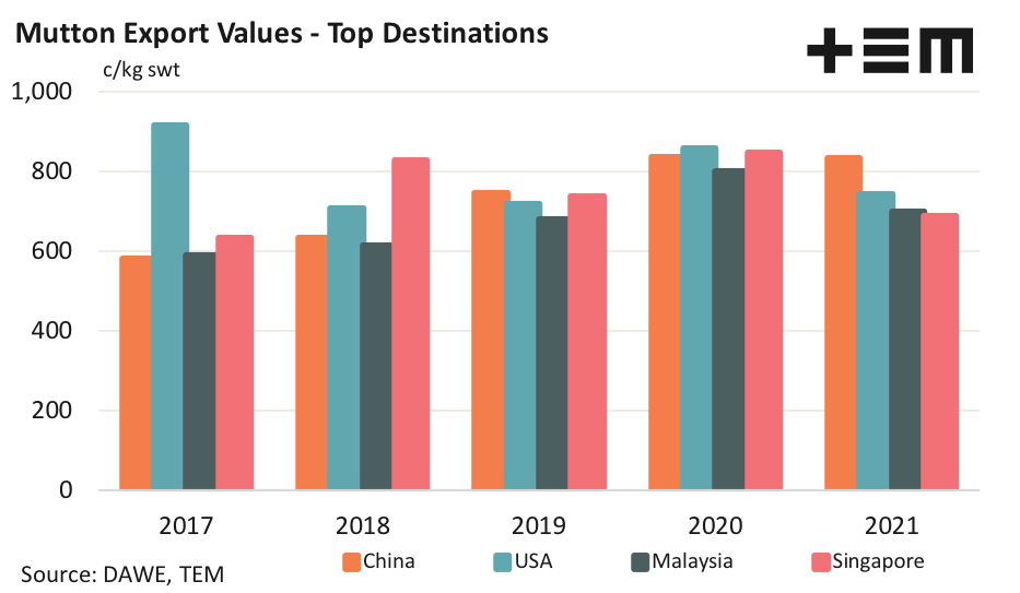 - Mutton export values into China have risen 44% from 582c/kg in 2017 to 837c/kg in 2020, dipping by a fraction to 834c/kg in 2021.
