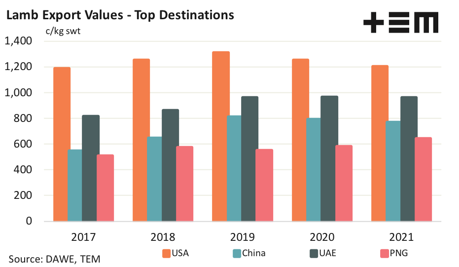 The USA maintained the top destination for average annual value of lamb exports with 1204c/kg swt for the 2021 season. Over the last five years lamb export values to the USA have averaged 1241c/kg, and while the current export values have softened from the peak of 1310c/kg in 2019 it is only showing an 8% decline.