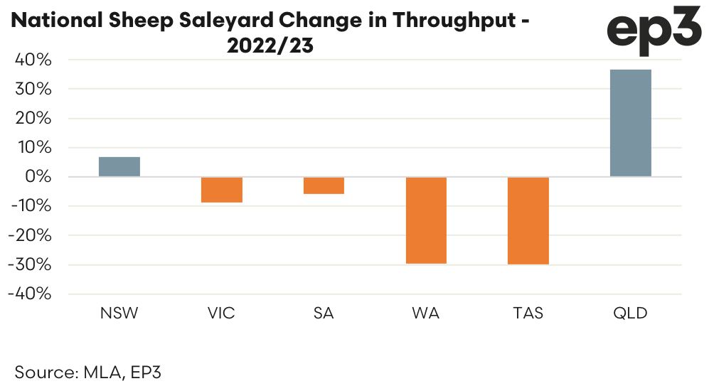 - NSW sheep & lamb saleyard throughput lifted by 6.8% over the last financial year. Queensland also saw an impressive gain of 36.6%, but it was off a very low base.
