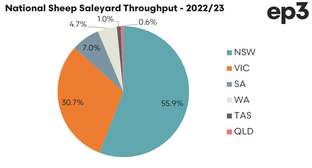 In terms of national market share, the NSW saleyards dominated the yarding volumes representing nearly 56% of the national throughput for 2022/23. Victoria backed up in second spot on nearly 31% of the national tally.