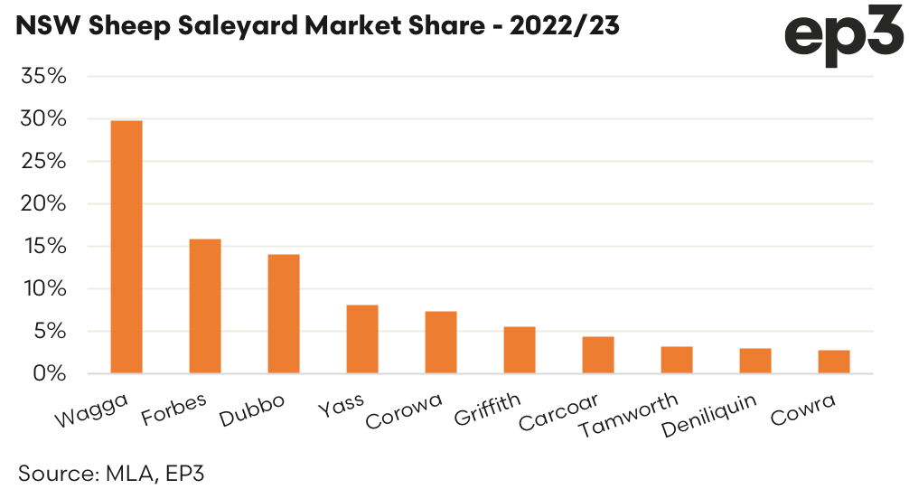 A focus on NSW top 10 saleyards saw Wagga Wagga retain number one spot for both state and national calculations. The Wagga Wagga saleyard represented 29.8% of total NSW saleyard yardings of sheep & lamb and on a national level it accounted for 16.6% of total yardings. Wagga Wagga saw a 6.0% lift in sheep & lamb throughput over the 2022/23 season, but the biggest annual gains seen in the top 10 NSW saleyards were reserved for Tamworth and Dubbo, which increased by 31.7% an 23.7%, respectively. Corowa, Carcoar and Deniliquin were the only top 10 yards to post declines in throughput over the last financial year, with falls of 1.3%, 4.3% and 4.2% recorded.