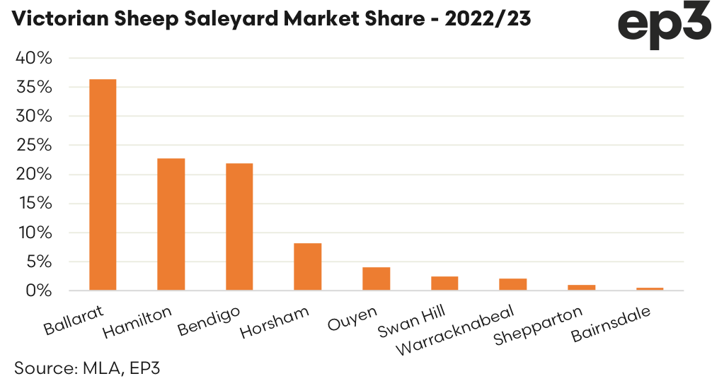 There was limited movement in the market share of the top 10 Victorian saleyards with Ballarat continuing to hold pole position and 36.6% of the state’s total sheep and lamb throughput, despite a 9.0% reduction in yarding over the 2022/23 season. Ballarat saw yarding volumes slip from 1,562,896 head to 1,422,487 head over the last financial year. Most of the top 10 Victorian saleyards posted declines in annual yarding levels with Hamilton, Ouyen and Bairnsdale recording falls into the double digits of 13.1%, 10.4% and 15.4%, respectively. Horsham was one of the few top 10 Victorian saleyards to register a gain in throughput of 5.7%.