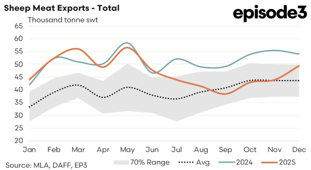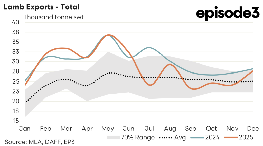 The 2025 sheep meat export season closed with a mixed but still historically strong outcome, characterised by softer year on year volumes but exports that remain well above longer run averages. Total lamb exports for the year reached 434,305 tonnes, sitting 4 percent below 2024 levels but still 15 percent above the five year average, while mutton exports totalled 222,275 tonnes, down 13 percent on the year yet 25 percent higher than the longer term norm.