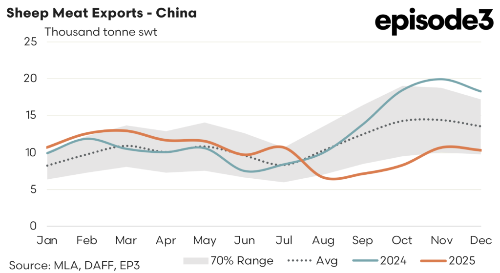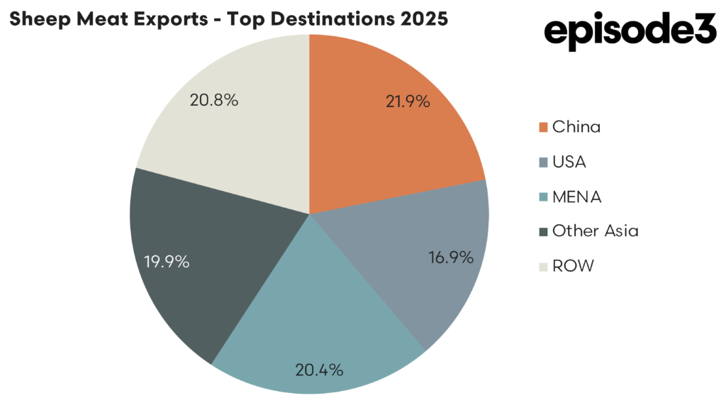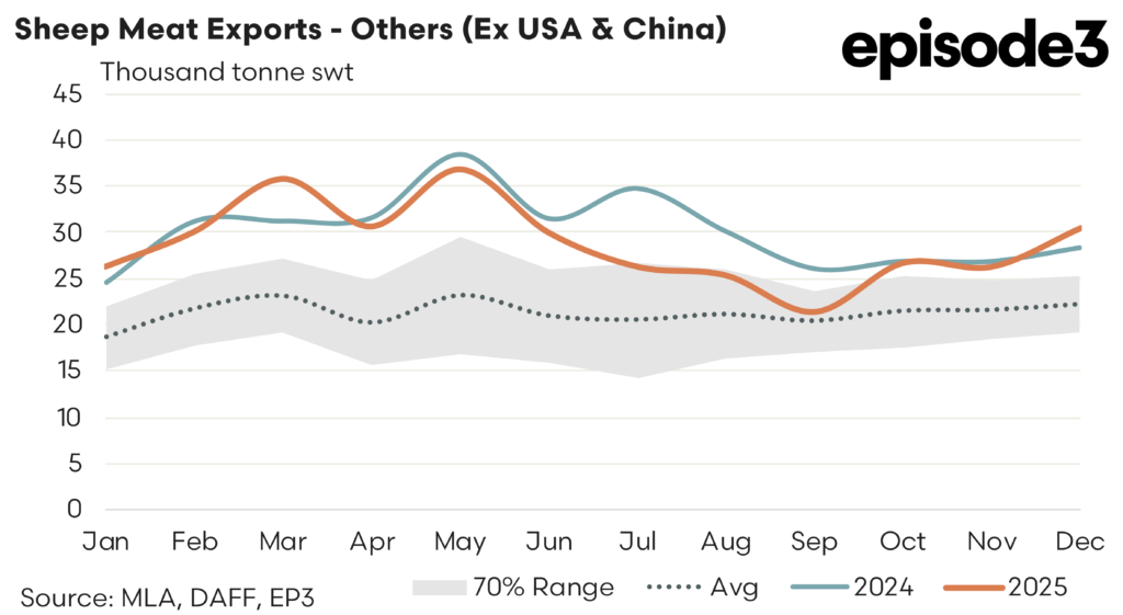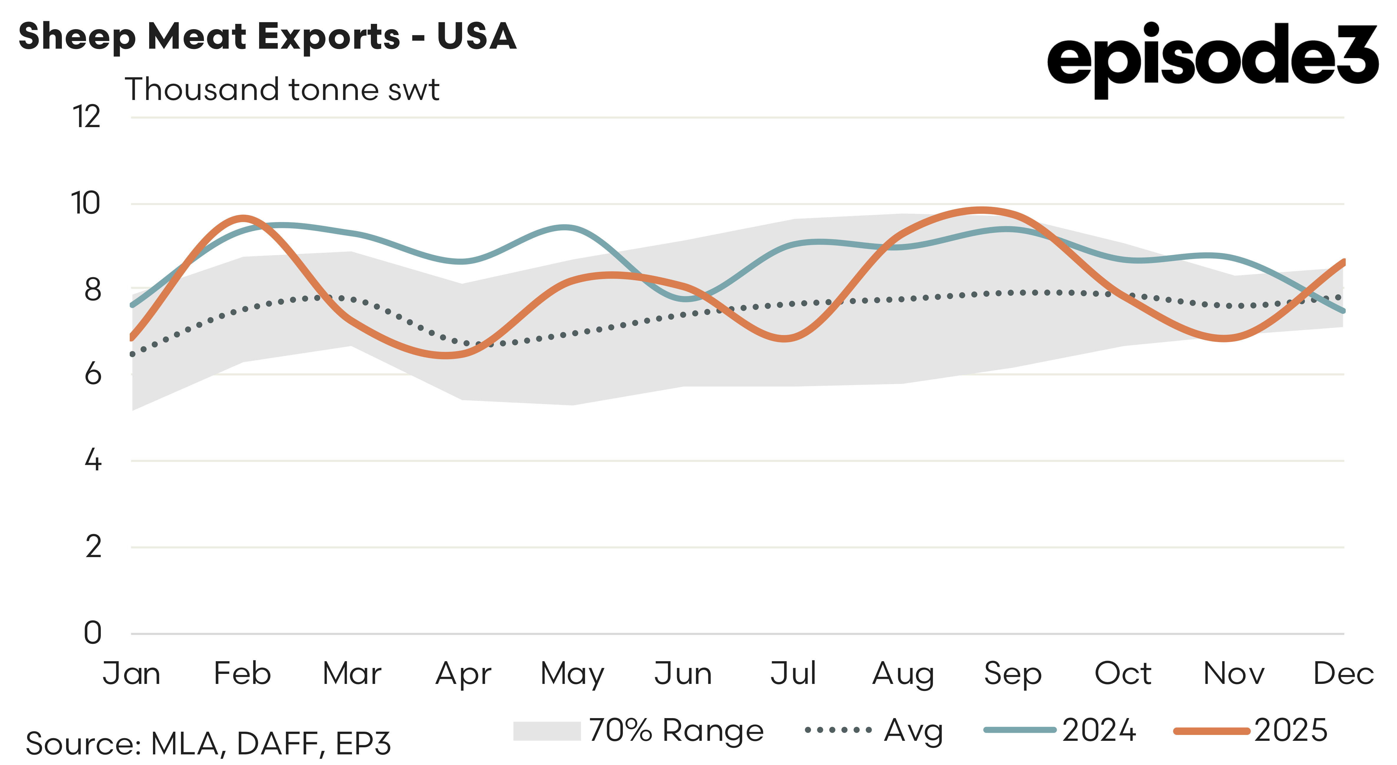 The United States accounted for 16.9 percent of total sheep meat exports in 2025 and remained a relatively stable outlet compared with some Asian markets. Fourth quarter volumes reached 23,357 tonnes. This was 6 percent lower than Q4 2024 but broadly in line with the five year average flows, highlighting a market that has grown steadily but without the extreme swings seen elsewhere. The US market continues to provide consistency for Australian exporters, particularly for lamb, even when seasonal softness emerges late in the calendar year.