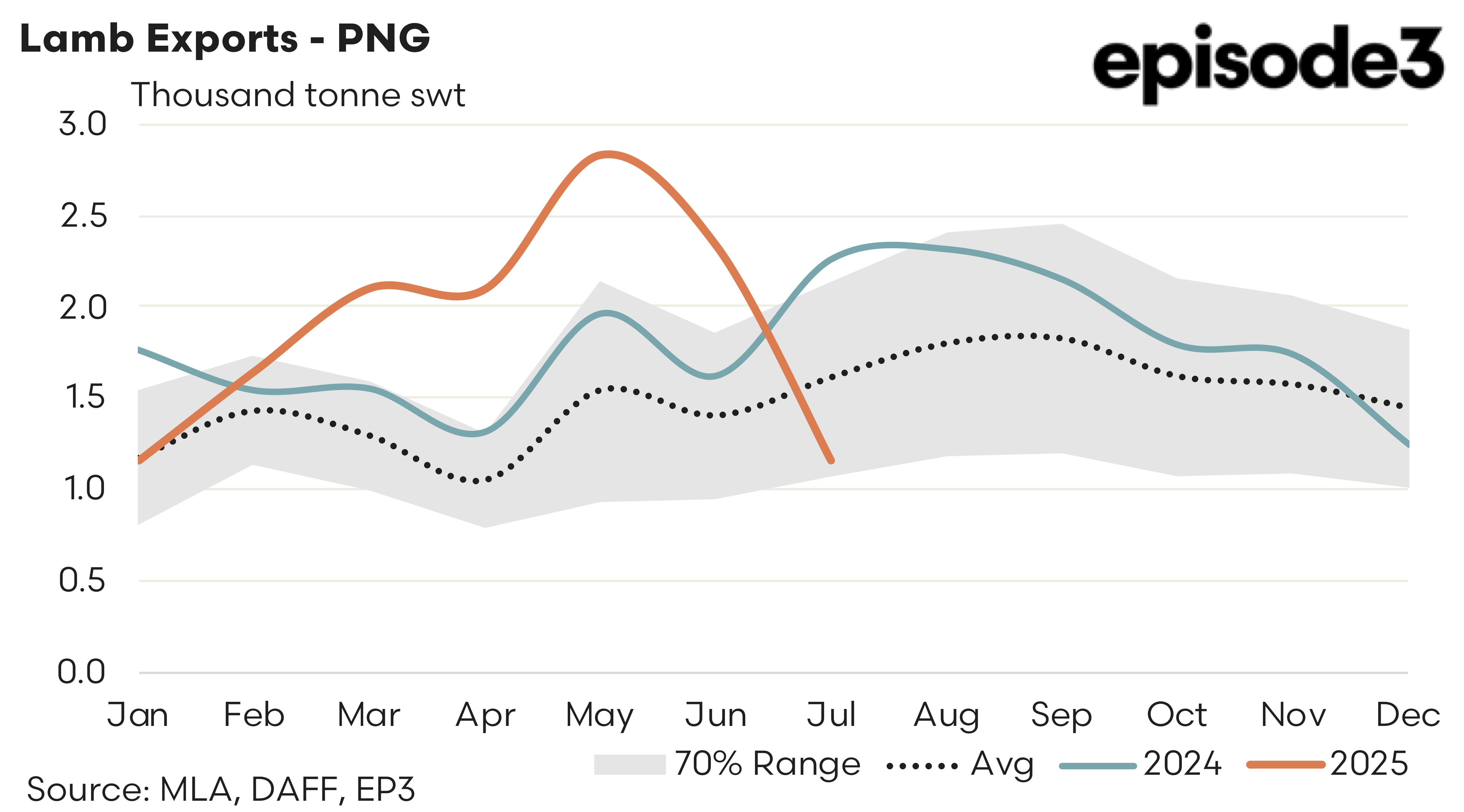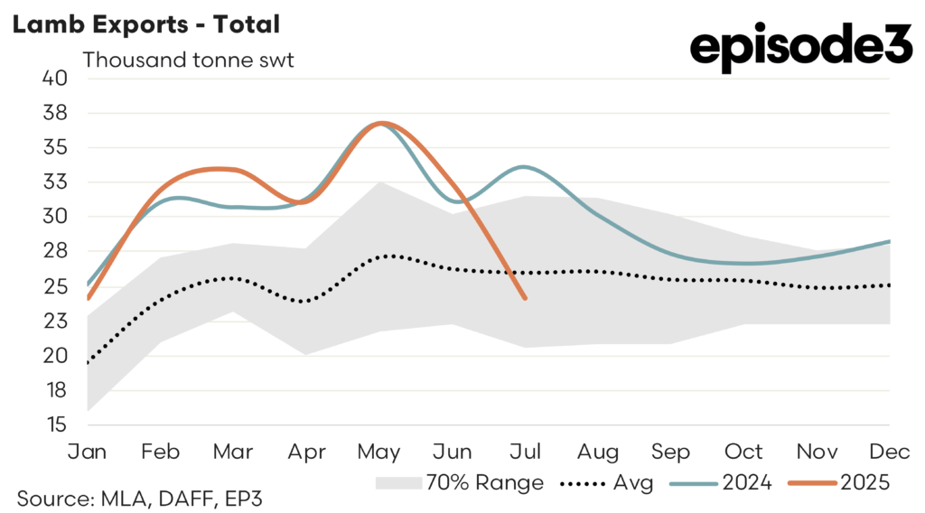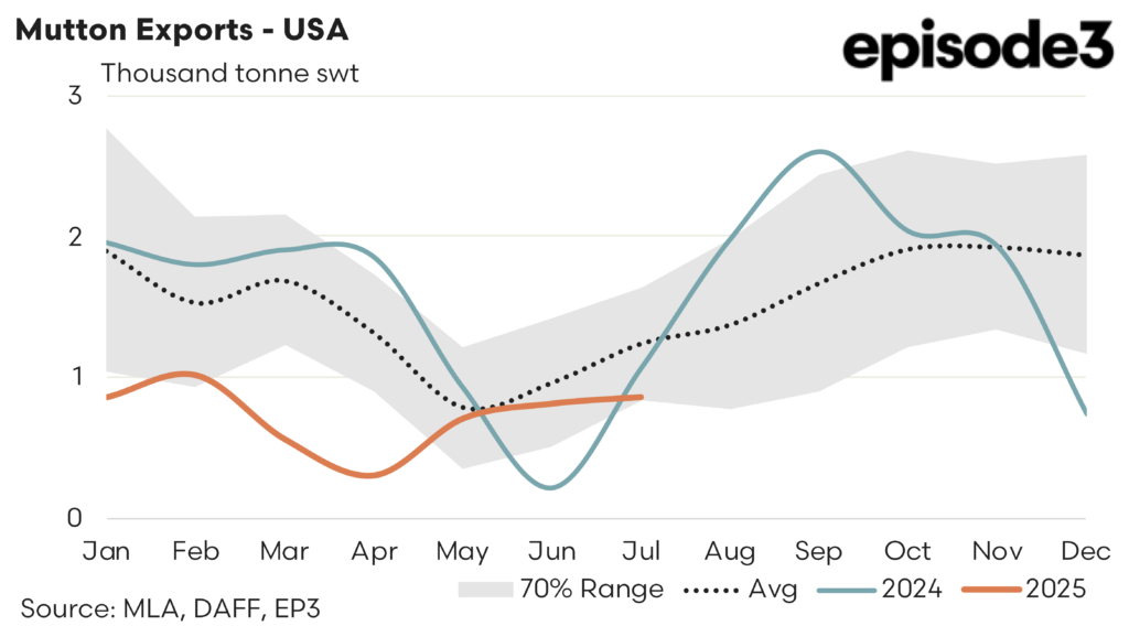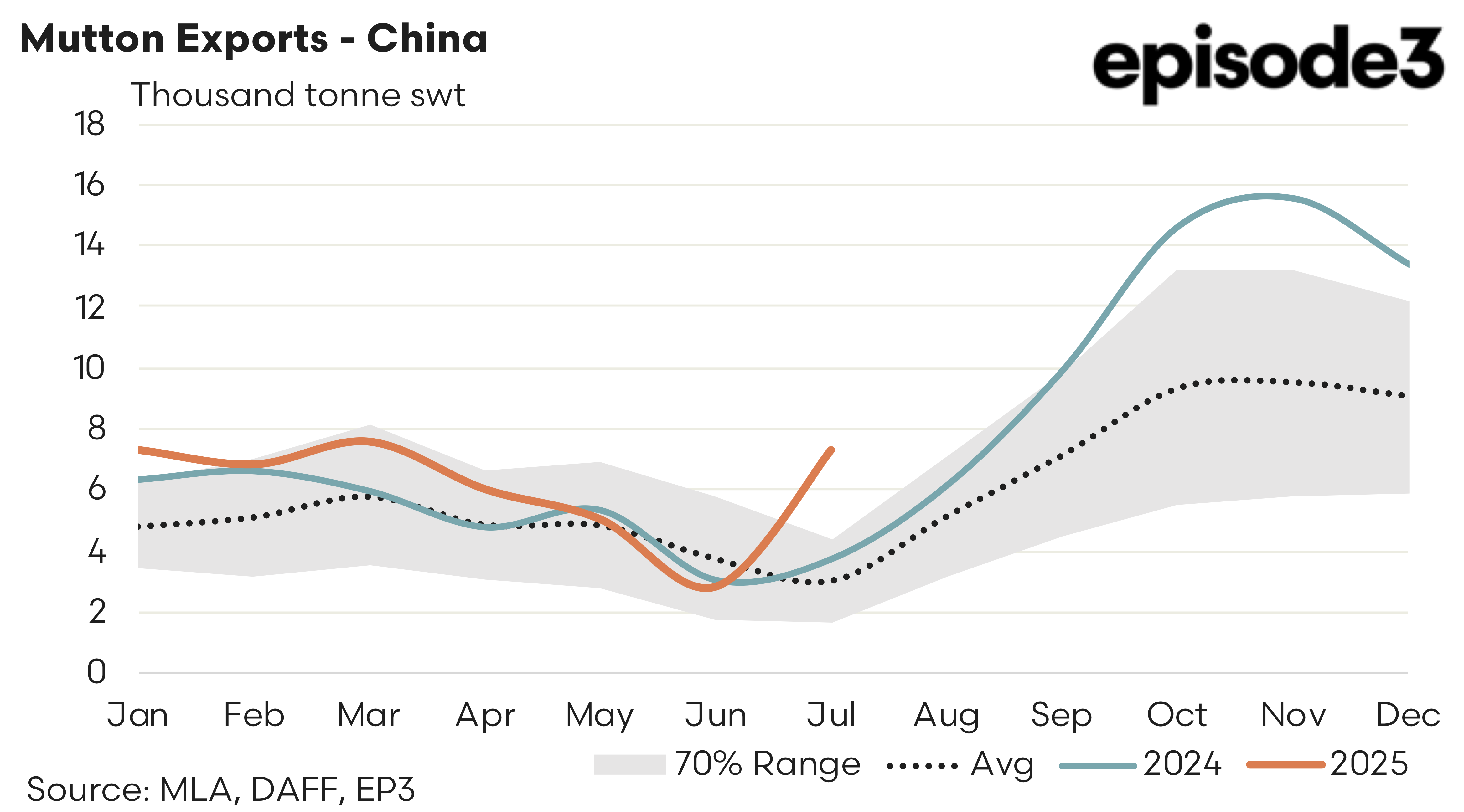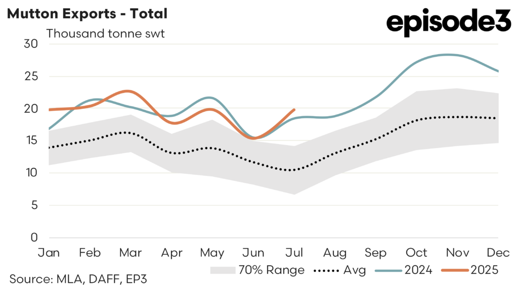 Total mutton exports from Australia remained resilient as some export destinations perhaps opted to switch from relatively more expensive lamb to relatively cheaper mutton. There was a 29% increase in mutton exports during July, taking the total flows to 19,776 tonnes. This represents levels that are slightly better than July 2024 and around 89% higher than the five-year average flows usually seen in July.