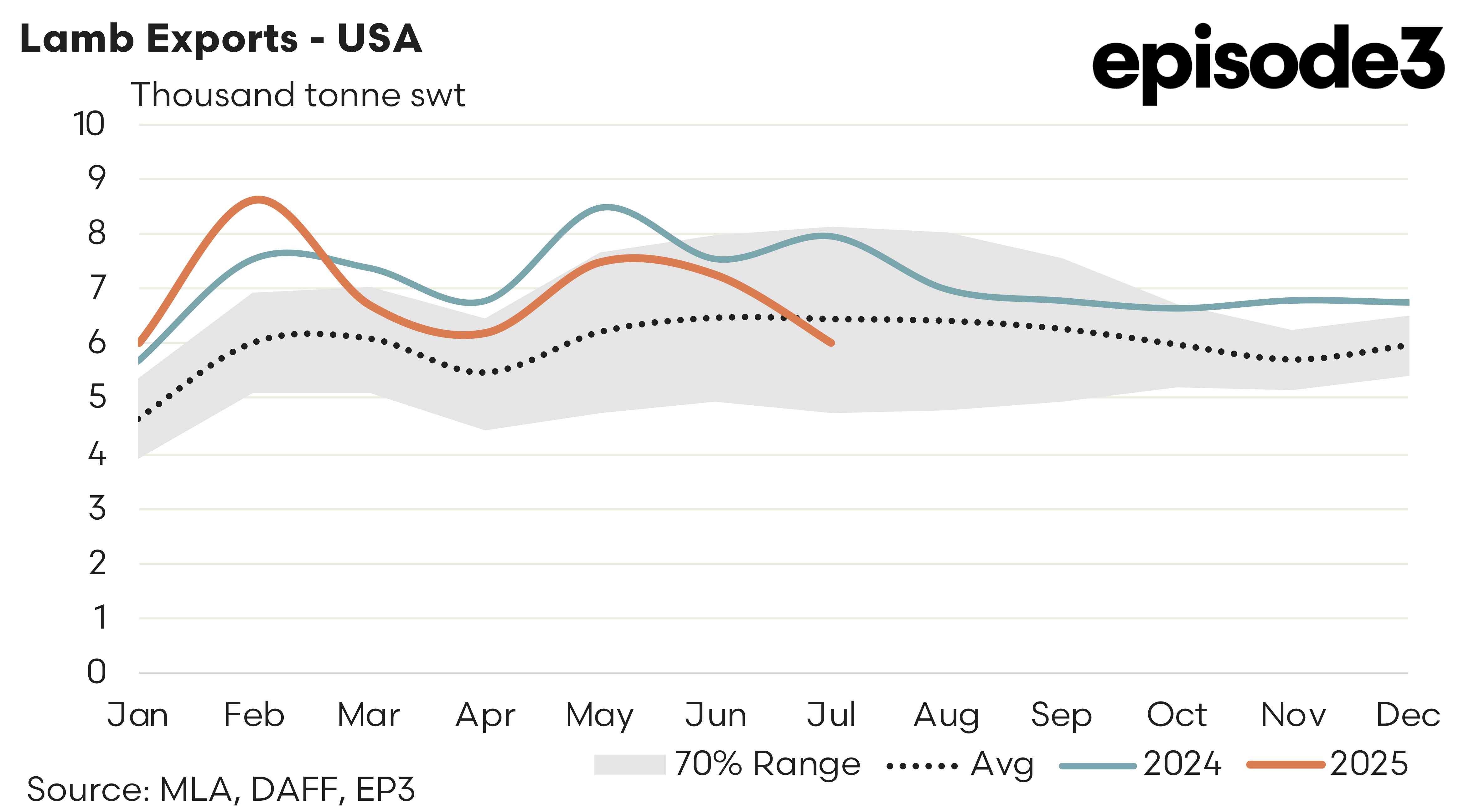 USA- The Aussie lamb trade to the USA dipped 17% in July to see 6,020 tonnes recorded shipped over the month. This pushed the monthly flows below the five-year seasonal average trend for the first time since October 2023. Current trade volumes to the USA are sitting 6% under the five-year average for July.