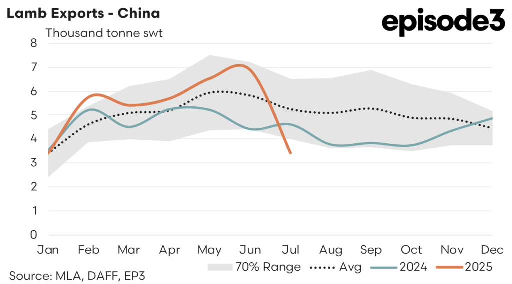 China – The was a sharp 50% decline in lamb exports to China during July with trade volumes dropping to 3,414 tonnes. The monthly trend for 2025 had been sitting near the upper end of the normal range and crashed to levels below the lower end of the normal range during the month. Presently monthly lamb export volumes to China are sitting 35% below the five-year average for July a significant turn around from sitting 18% above the five-year average levels in June.