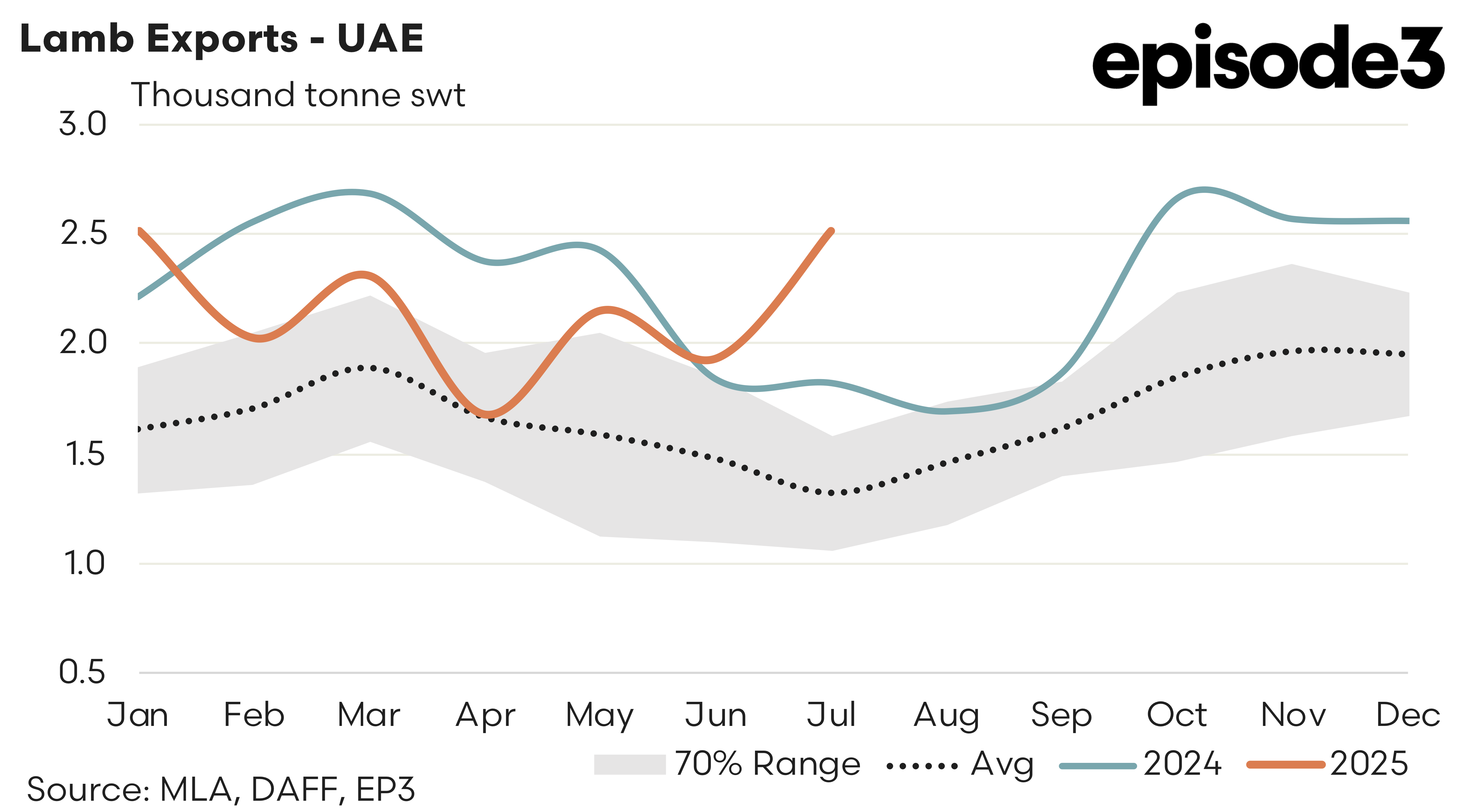UAE – The United Arab Emirate were the bright spark of the top trade destinations for Aussie lamb in July with a 30% gain in volumes noted over the month. There was 2,516 tonnes shipped during July, taking the current trade flows to levels that are 91% above the five-year average flows for the July period.