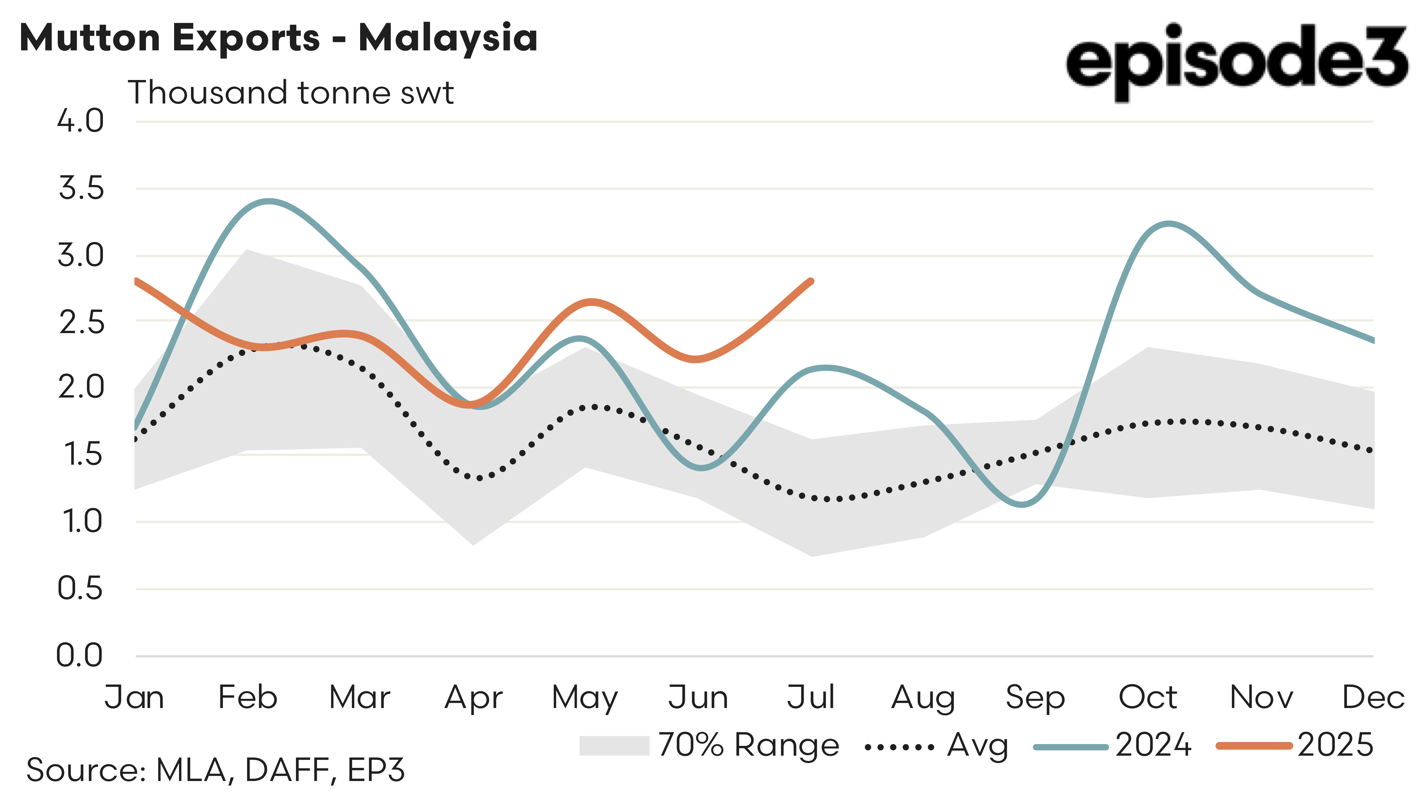 Malaysia – Mutton demand in Malaysia has remained firm with a 26% increase over July noted. There was 2,792 tonnes shipped to Malaysia over the month taking current trade volumes of Aussie mutton to levels that are 135% above the five-year average flows for July.