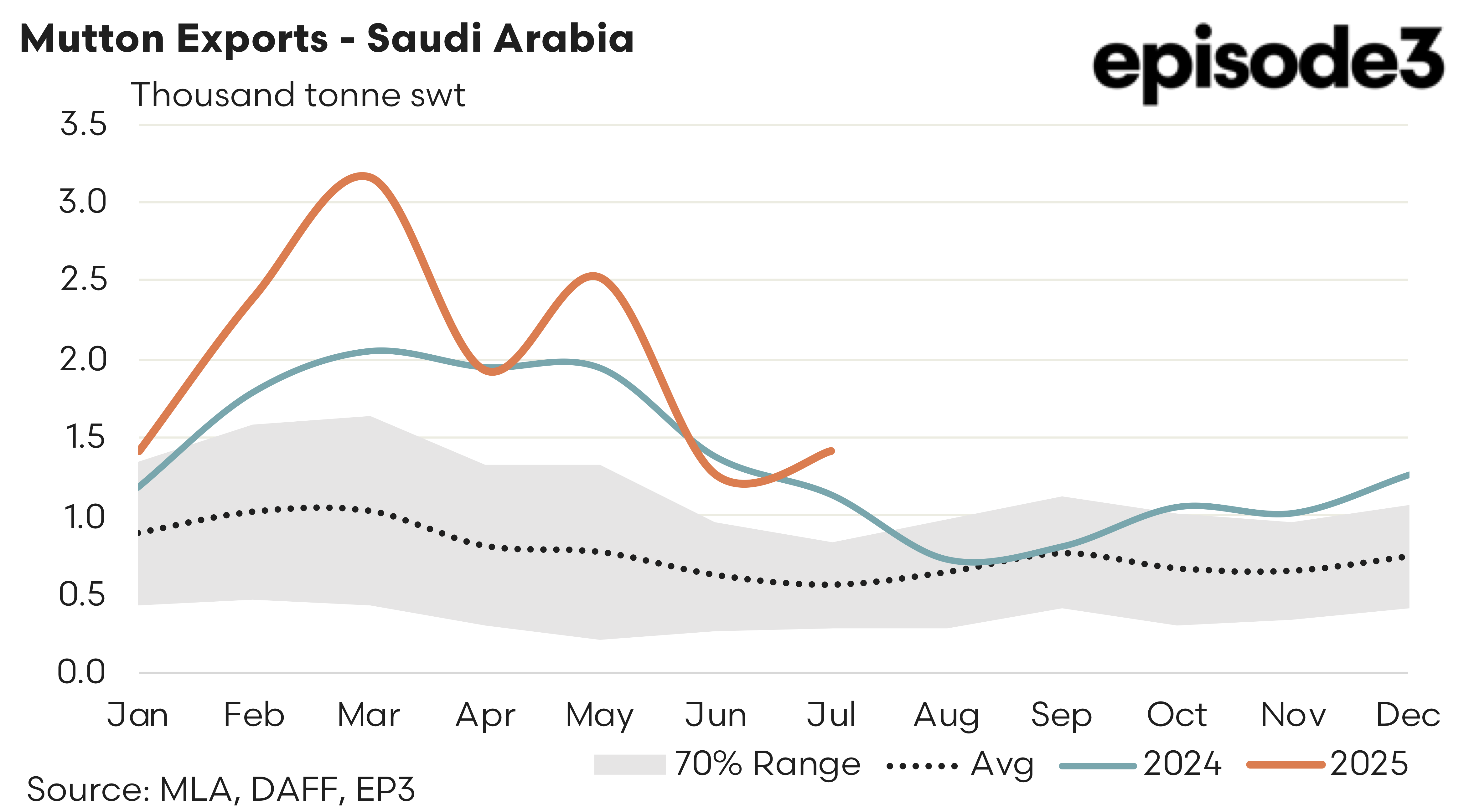 Saudi Arabia – Mutton flows to Saudi Arabia have been in a broad downtrend since March, albeit from very strong levels. July saw a mild bucking of the trend with Aussie mutton exports lifting by 12% to 1,416 tonnes shipped. Compared to historic flows the trade to Saudi Arabia remains in great shape though with current mutton trade volumes sitting 153% higher than the normal July levels, based upon the average volumes seen over the last five years of the trade.