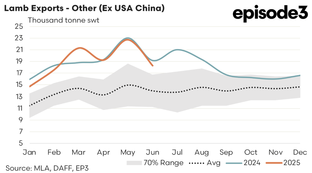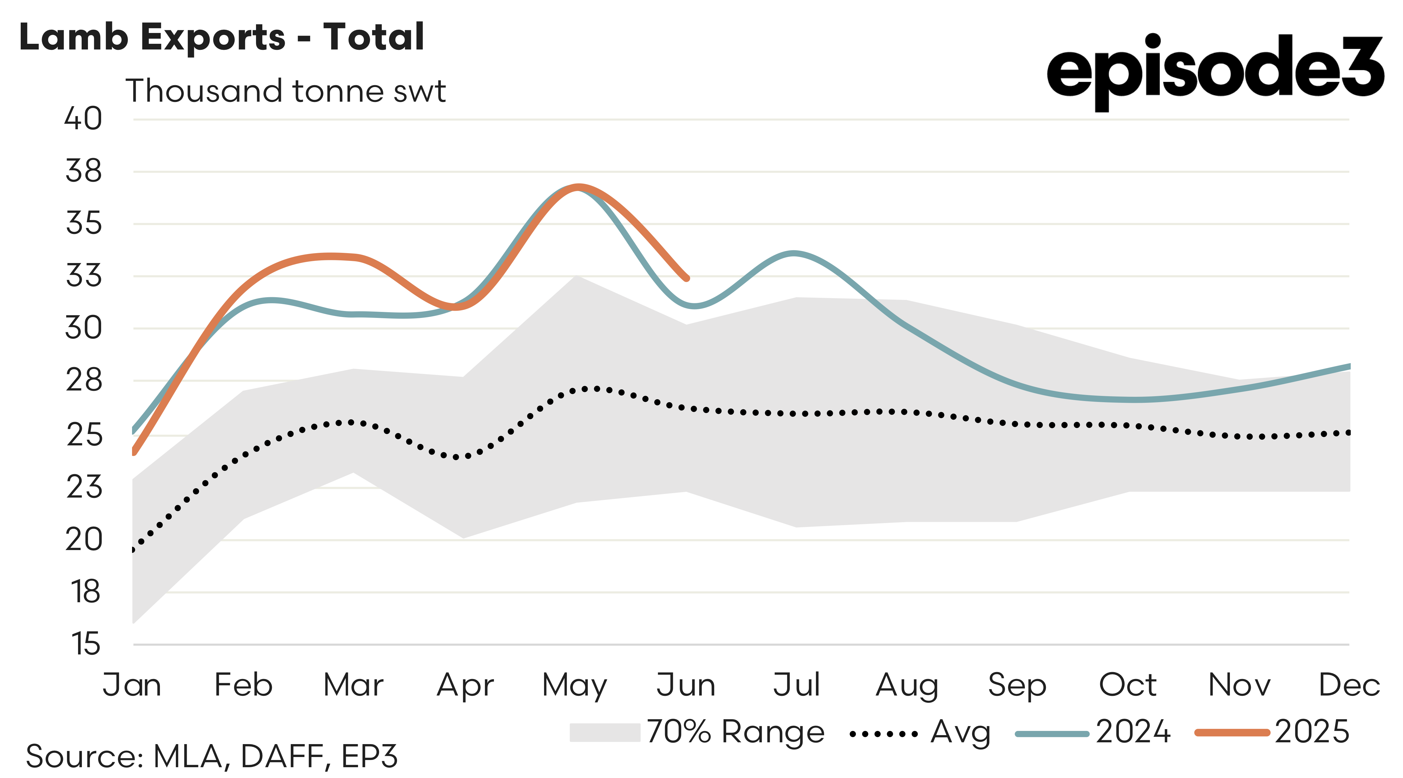 Total Australian lamb export flows eased by 12% to see 32,437 tonnes shipped offshore over the month. Despite the easing in the trade the flows seen during June 2025 still outperformed June 2024 by 4% and remain at levels that are 23% higher than the five-year average lamb export levels for the June period.