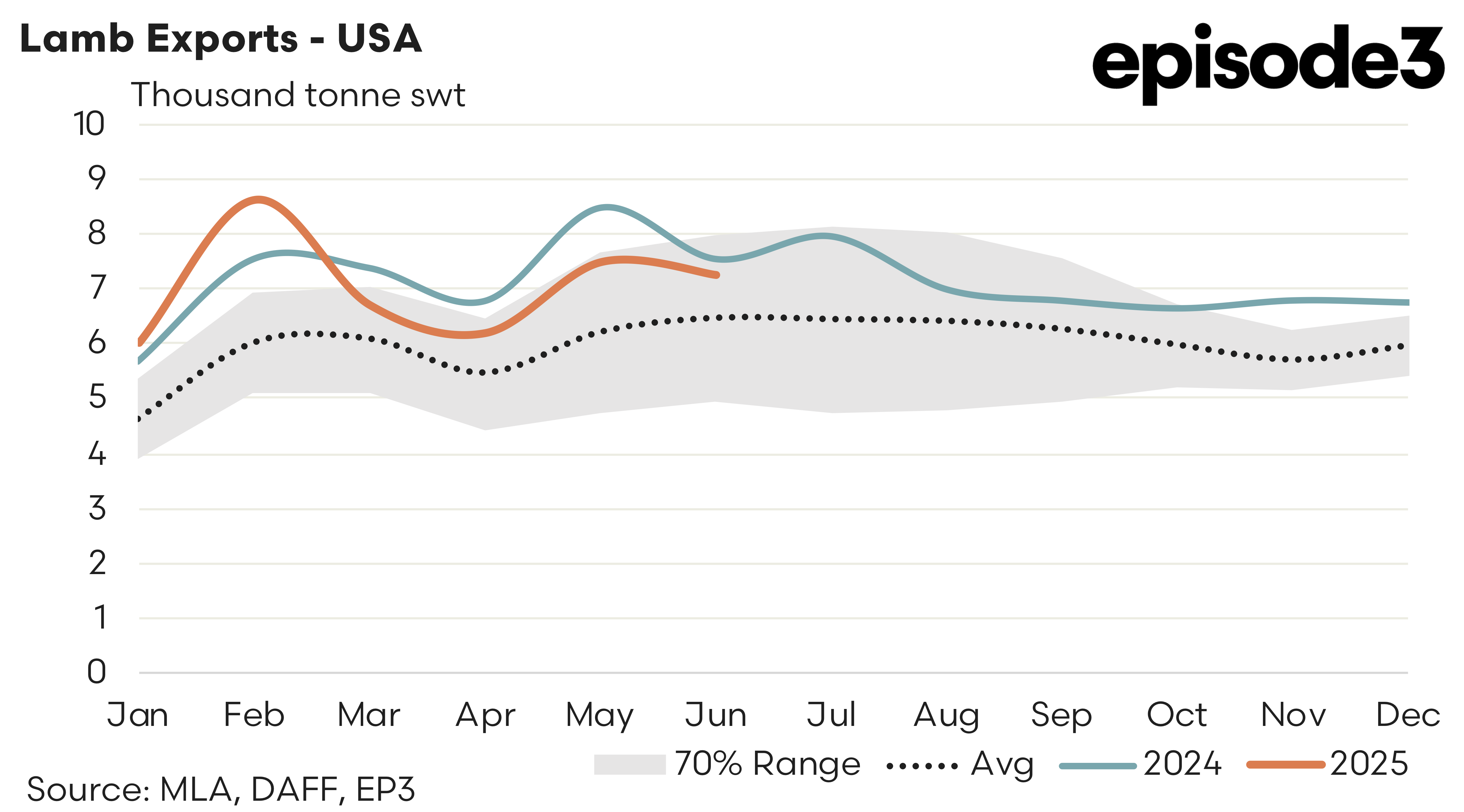 USA- There was a mild 3% easing in Australian lamb exports to the USA during June to see 7,255 tonnes sent offshore. Despite the slight decline the trade remains reasonably healthy sitting at levels that are 12% higher than the five-year average for June.
