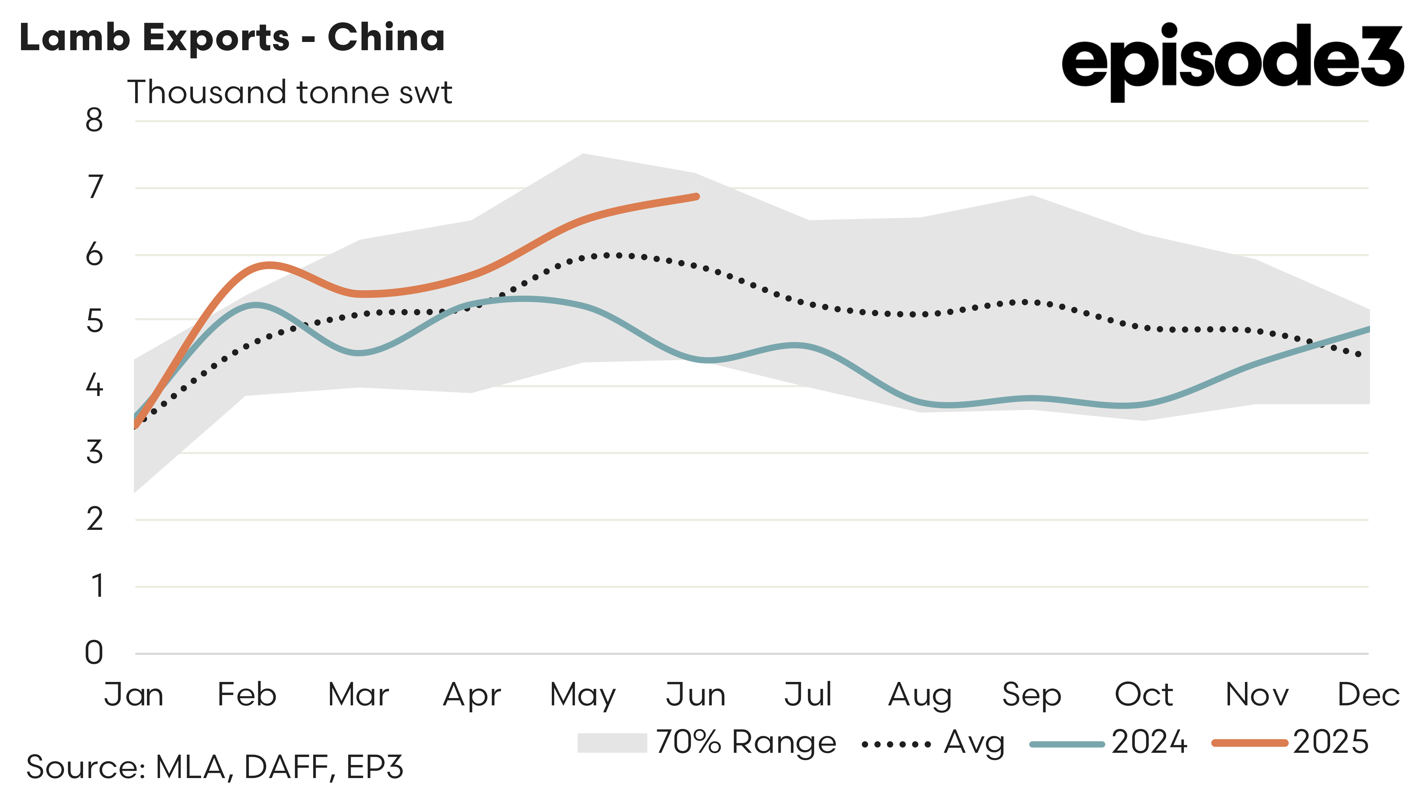 China – Lamb trade flows to China bucked the broad trend for June with a 5% lift reported to hit 6,868 tonnes shipped over the month. This represents lamb export flows that are 18% above the June average lamb trade levels, based upon the last five years of the trade.