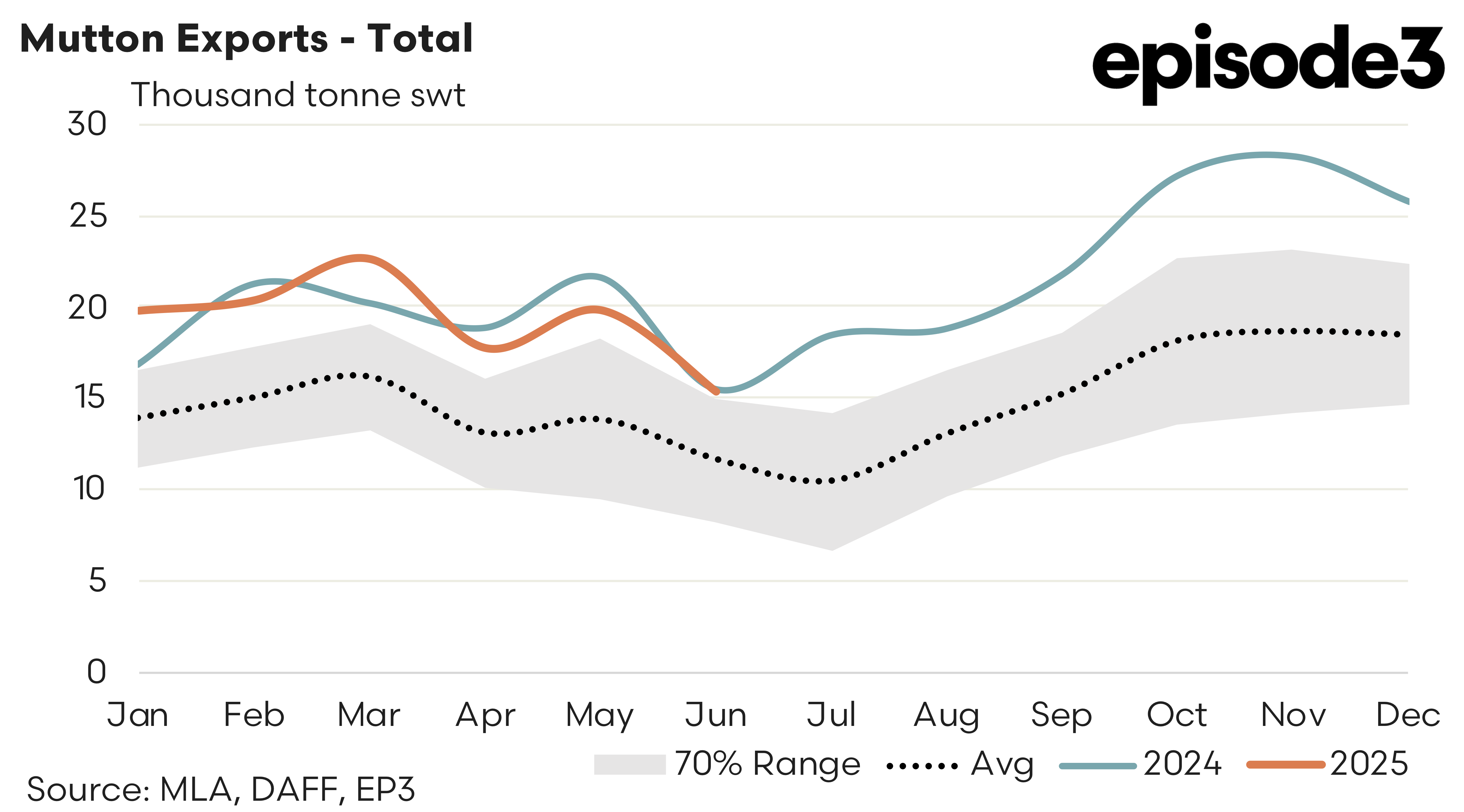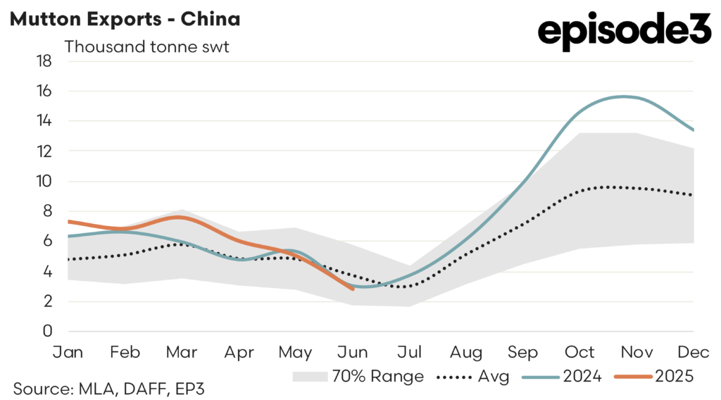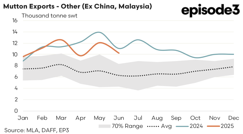 Total mutton exports from Australia had a stronger reaction to lamb to the higher livestock pricing with a 22% drop in mutton exports noted over June. At 15,374 tonnes shipped during June the current mutton export flows have closely matched the trade levels seen during June 2024 and are trading at levels 32% higher than the normal June average flows, based upon the last five years of the trade.