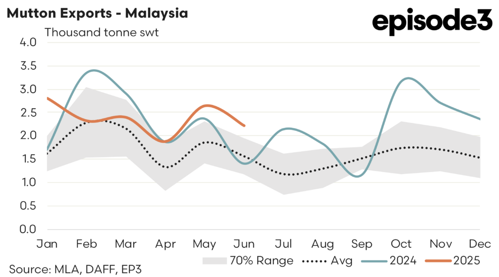 Malaysia – The Aussie mutton trade to Malaysia eased by 16% during June to see 2,220 tonnes shipped over the month. Despite the reduced flows this still represents relatively strong Malaysian demand for Australian sheep meat with the trade volumes sitting at a healthy 41% above the five-year average trend. Indeed, this it the third consecutive month that trade flows of Aussie mutton to Malaysia have been 41% higher than the five-year average monthly levels.